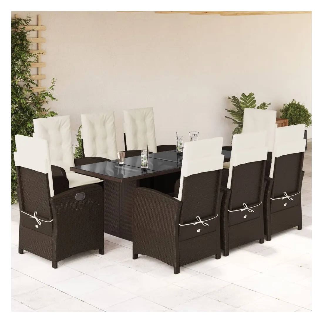 Cet ensemble de salle à manger de jardin est un excellent choix pour les repas en plein air ou pour vous détendre dans le jardin, dans l'arrière-cour ou sur la terrasse. Matériau durable : la résine tressée, également connue sous le nom de poly rotin, est un matériau synthétique solide et nécessitant peu d'entretien qui ressemble au rotin naturel. Il est léger, facile à nettoyer et couramment utilisé pour les meubles d'extérieur en raison de sa durabilité et de ses propriétés de résistance aux intempéries.Dossier réglable : ce siège de jardin est doté d'une poignée. Vous pouvez régler le dossier dans n'importe quelle position en tirant sur la poignée et le remettre rapidement dans sa position initiale.Expérience d'assise confortable : ce mobilier d'extérieur, doté de coussins épais, offre une expérience d'assise confortable.Housse amovible et lavable : ces coussins de siège sont dotés de housses amovibles pour un lavage et un entretien faciles. Les coussins de dossier ont un rabat à l'arrière pour une fixation facile aux dossiers.Dessus en verre : le dessus de la table d'extérieur est fabriqué en verre trempé solide et durable, ce qui le rend facile à nettoyer avec un chiffon humide et ajoute une touche d'élégance à votre espace extérieur. Bon à savoir :Pour que vos meubles d'extérieur restent beaux, nous vous recommandons de les protéger avec une housse imperméable.