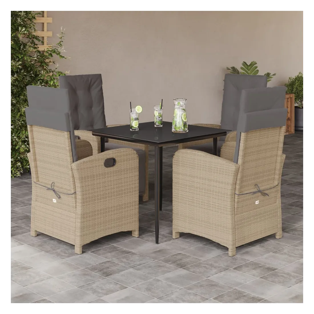 Cet ensemble de salle à manger de jardin est un excellent choix pour les repas en plein air ou pour vous détendre dans le jardin, dans l'arrière-cour ou sur la terrasse. Matériau durable : la résine tressée, également connue sous le nom de poly rotin, est un matériau synthétique solide et nécessitant peu d'entretien qui ressemble au rotin naturel. Il est léger, facile à nettoyer et couramment utilisé pour les meubles d'extérieur en raison de sa durabilité et de ses propriétés de résistance aux intempéries.Dossier réglable : ce siège de jardin est doté d'une poignée. Vous pouvez régler le dossier dans n'importe quelle position en tirant sur la poignée et le remettre rapidement dans sa position initiale.Expérience d'assise confortable : ce mobilier d'extérieur, doté de coussins épais, offre une expérience d'assise confortable.Housse amovible et lavable : ces coussins de siège sont dotés de housses amovibles pour un lavage et un entretien faciles. Les coussins de dossier ont un rabat à l'arrière pour une fixation facile aux dossiers.Dessus en verre : le dessus de la table d'extérieur est fabriqué en verre trempé solide et durable, ce qui le rend facile à nettoyer avec un chiffon humide et ajoute une touche d'élégance à votre espace extérieur. Bon à savoir :Pour que vos meubles d'extérieur restent beaux, nous vous recommandons de les protéger avec une housse imperméable.