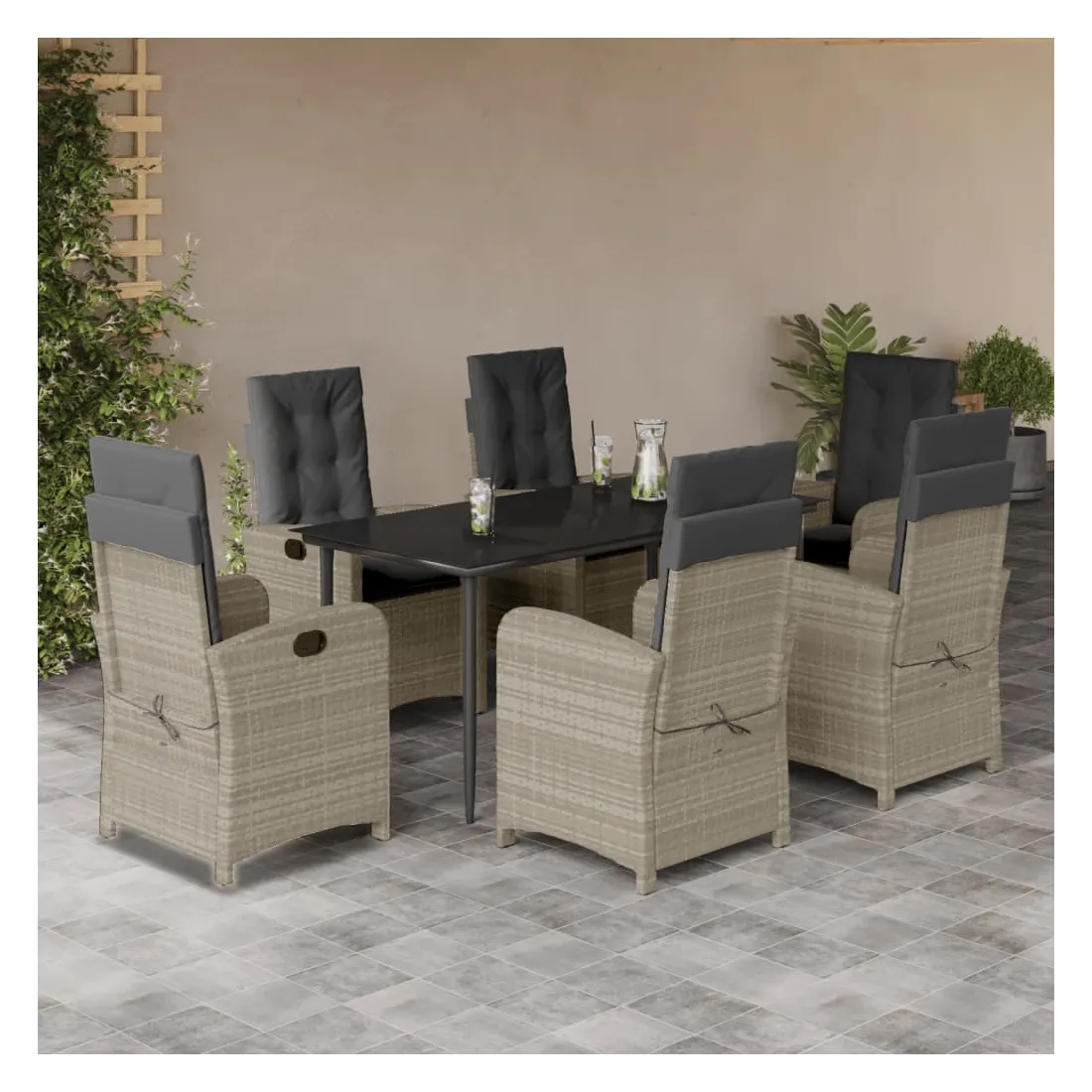Cet ensemble de salle à manger de jardin est un excellent choix pour les repas en plein air ou pour vous détendre dans le jardin, dans l'arrière-cour ou sur la terrasse. Matériau durable : la résine tressée, également connue sous le nom de poly rotin, est un matériau synthétique solide et nécessitant peu d'entretien qui ressemble au rotin naturel. Il est léger, facile à nettoyer et couramment utilisé pour les meubles d'extérieur en raison de sa durabilité et de ses propriétés de résistance aux intempéries.Dossier réglable : ce siège de jardin est doté d'une poignée. Vous pouvez régler le dossier dans n'importe quelle position en tirant sur la poignée et le remettre rapidement dans sa position initiale.Expérience d'assise confortable : ce mobilier d'extérieur, doté de coussins épais, offre une expérience d'assise confortable.Housse amovible et lavable : ces coussins de siège sont dotés de housses amovibles pour un lavage et un entretien faciles. Les coussins de dossier ont un rabat à l'arrière pour une fixation facile aux dossiers.Dessus en verre : le dessus de la table d'extérieur est fabriqué en verre trempé solide et durable, ce qui le rend facile à nettoyer avec un chiffon humide et ajoute une touche d'élégance à votre espace extérieur. Bon à savoir :Pour que vos meubles d'extérieur restent beaux, nous vous recommandons de les protéger avec une housse imperméable.