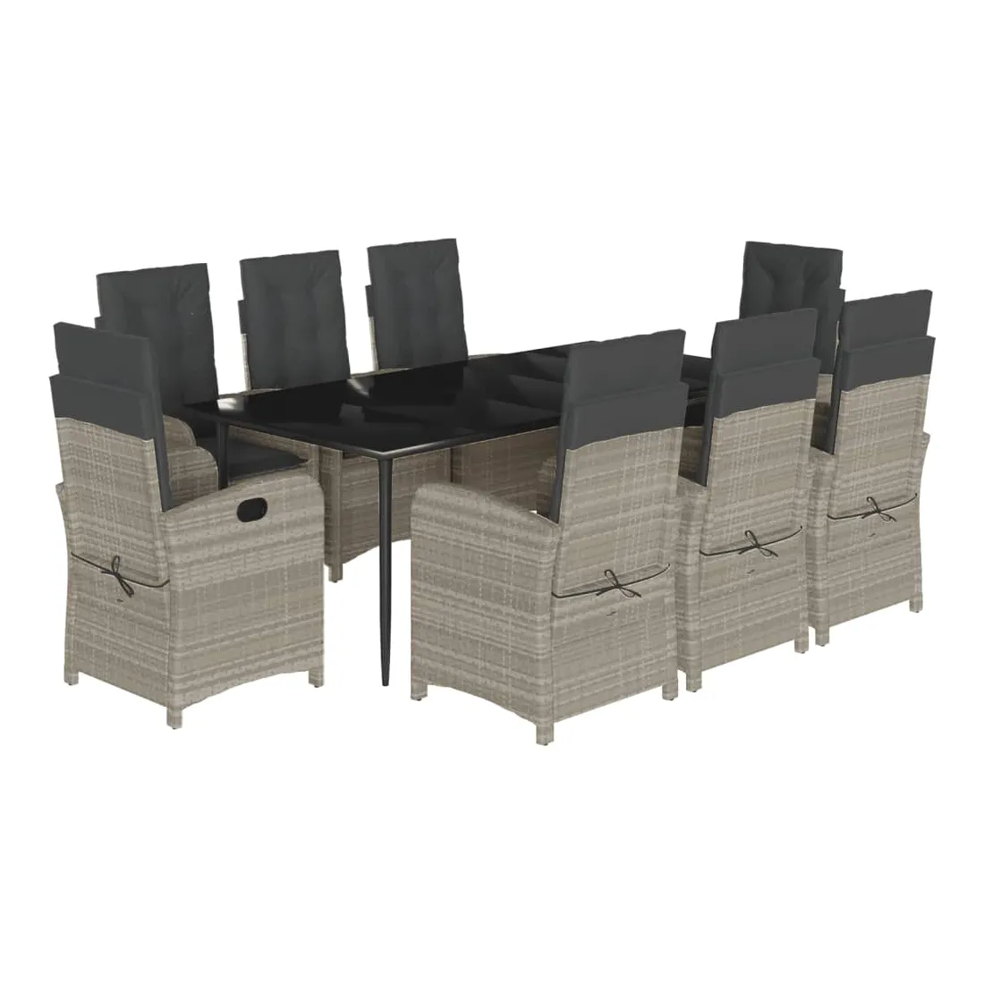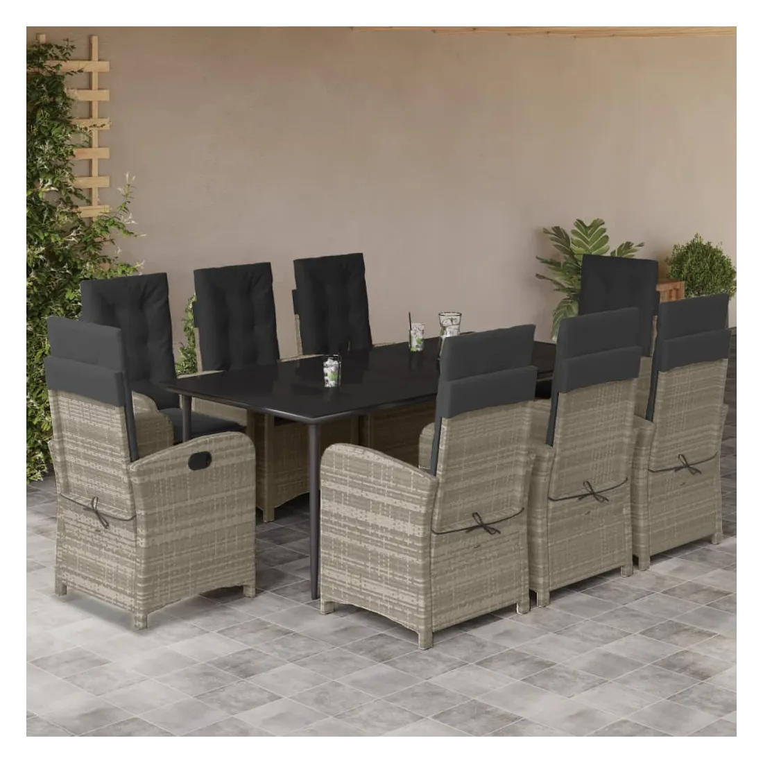Cet ensemble de salle à manger de jardin est un excellent choix pour les repas en plein air ou pour vous détendre dans le jardin, dans l'arrière-cour ou sur la terrasse. Matériau durable : la résine tressée, également connue sous le nom de poly rotin, est un matériau synthétique solide et nécessitant peu d'entretien qui ressemble au rotin naturel. Il est léger, facile à nettoyer et couramment utilisé pour les meubles d'extérieur en raison de sa durabilité et de ses propriétés de résistance aux intempéries.Dossier réglable : ce siège de jardin est doté d'une poignée. Vous pouvez régler le dossier dans n'importe quelle position en tirant sur la poignée et le remettre rapidement dans sa position initiale.Expérience d'assise confortable : ce mobilier d'extérieur, doté de coussins épais, offre une expérience d'assise confortable.Housse amovible et lavable : ces coussins de siège sont dotés de housses amovibles pour un lavage et un entretien faciles. Les coussins de dossier ont un rabat à l'arrière pour une fixation facile aux dossiers.Dessus en verre : le dessus de la table d'extérieur est fabriqué en verre trempé solide et durable, ce qui le rend facile à nettoyer avec un chiffon humide et ajoute une touche d'élégance à votre espace extérieur. Bon à savoir :Pour que vos meubles d'extérieur restent beaux, nous vous recommandons de les protéger avec une housse imperméable.