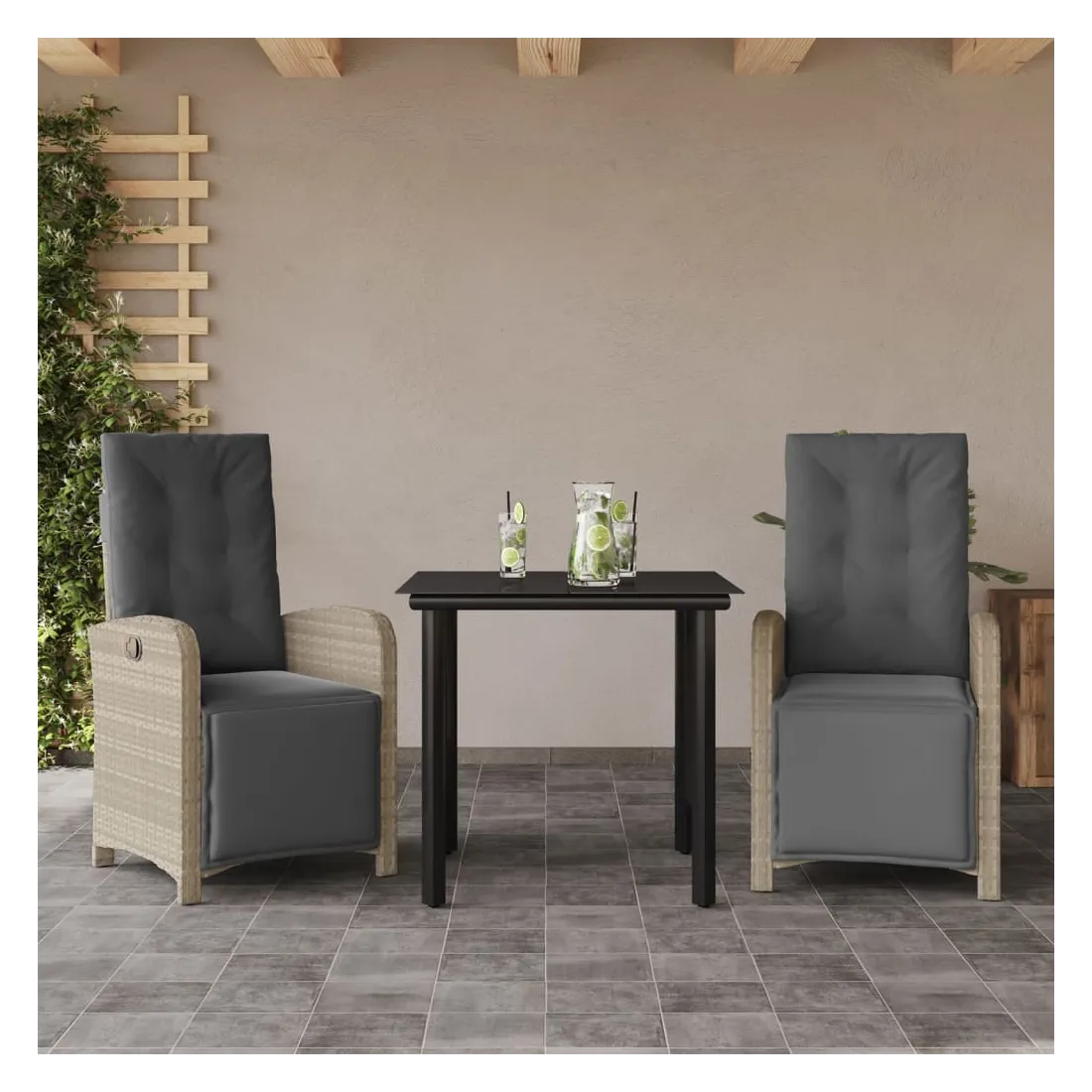 Savourez une tasse de café ou discutez avec votre famille et vos amis dans le jardin, l'arrière-cour ou sur le balcon avec cet ensemble de bistro confortable ! Matériau durable : la résine tressée, également connue sous le nom de poly rotin, est un matériau synthétique solide et nécessitant peu d'entretien qui ressemble au rotin naturel. Il est léger, facile à nettoyer et couramment utilisé pour les meubles d'extérieur en raison de sa durabilité et de ses propriétés de résistance aux intempéries.Dossier et repose-pied réglables : ce siège de jardin est doté d'une poignée. Vous pouvez régler le dossier et le repose-pied dans n'importe quelle position en tirant sur la poignée, et les remettre rapidement dans leur position initiale.Expérience d'assise confortable : ce mobilier d'extérieur, doté de coussins épais, offre une expérience d'assise confortable.Housse amovible et lavable : ces coussins de siège sont dotés de housses amovibles pour un lavage et un entretien faciles. Les coussins de dossier ont un rabat à l'arrière pour une fixation facile aux dossiers.Dessus en verre : le dessus de la table d'extérieur est fabriqué en verre trempé solide et durable, ce qui le rend facile à nettoyer avec un chiffon humide et ajoute une touche d'élégance à votre espace extérieur. Bon à savoir :Pour que vos meubles d'extérieur restent beaux, nous vous recommandons de les protéger avec une housse imperméable.