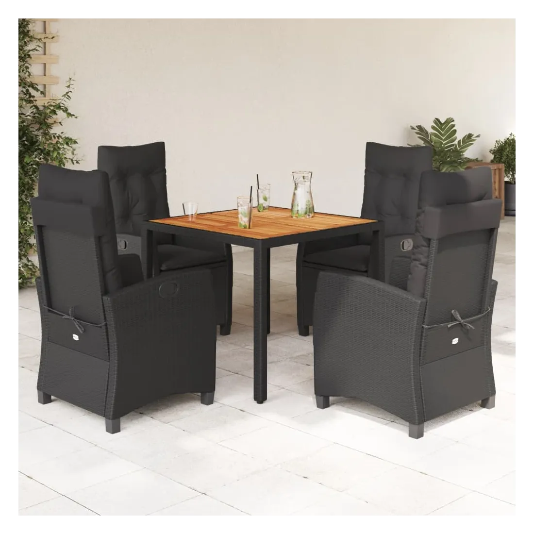Cet ensemble de salle à manger de jardin est un excellent choix pour les repas en plein air ou pour vous détendre dans le jardin, l'arrière-cour ou le patio. Matériau durable : la résine tressée, également connue sous le nom de poly rotin, est un matériau synthétique solide et nécessitant peu d'entretien qui ressemble au rotin naturel. Il est léger, facile à nettoyer et couramment utilisé pour les meubles d'extérieur en raison de sa durabilité et de ses propriétés de résistance aux intempéries. Dossier réglable : ce siège de jardin est doté d'une poignée. Vous pouvez régler le dossier dans n'importe quelle position en tirant sur la poignée et le remettre rapidement dans sa position initiale.Dessus stable et facile à nettoyer : cette table de jardin a un dessus en bois d'acacia robuste, durable et facile à nettoyer avec un chiffon humide. Expérience d'assise confortable : ce mobilier d'extérieur, doté de coussins épais, offre une expérience d'assise confortable. Housse amovible et lavable : ces coussins de siège sont dotés de housses amovibles pour un lavage et un entretien faciles. Bon à savoir :Pour que vos meubles d'extérieur restent beaux, nous vous recommandons de les protéger avec une housse imperméable.