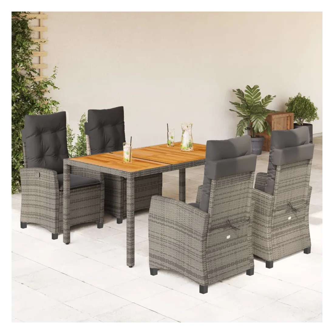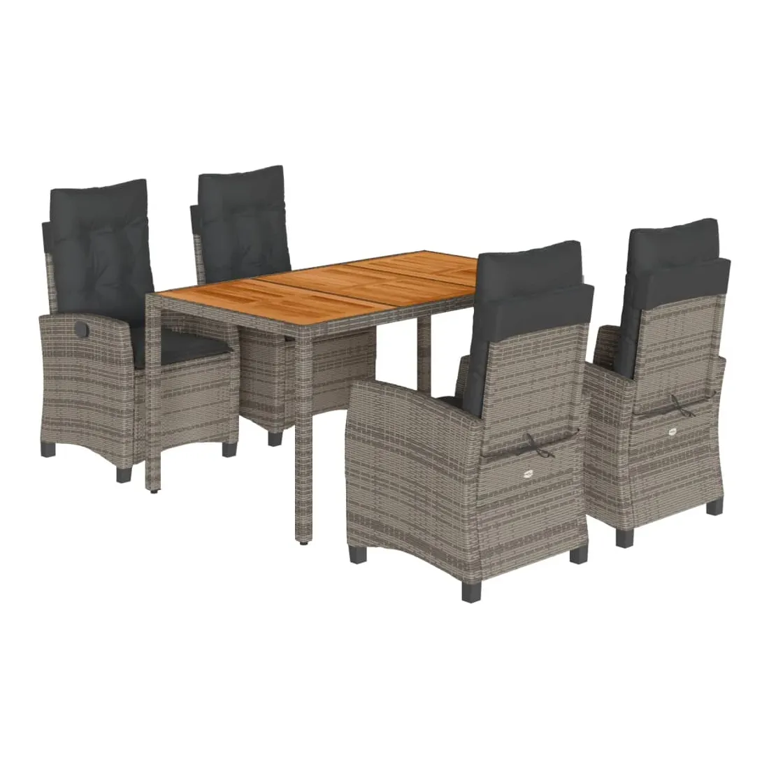 Cet ensemble de salle à manger de jardin est un excellent choix pour les repas en plein air ou pour vous détendre dans le jardin, l'arrière-cour ou le patio. Matériau durable : la résine tressée, également connue sous le nom de poly rotin, est un matériau synthétique solide et nécessitant peu d'entretien qui ressemble au rotin naturel. Il est léger, facile à nettoyer et couramment utilisé pour les meubles d'extérieur en raison de sa durabilité et de ses propriétés de résistance aux intempéries. Dossier réglable : ce siège de jardin est doté d'une poignée. Vous pouvez régler le dossier dans n'importe quelle position en tirant sur la poignée et le remettre rapidement dans sa position initiale.Dessus stable et facile à nettoyer : cette table de jardin a un dessus en bois d'acacia robuste, durable et facile à nettoyer avec un chiffon humide. Expérience d'assise confortable : ce mobilier d'extérieur, doté de coussins épais, offre une expérience d'assise confortable. Housse amovible et lavable : ces coussins de siège sont dotés de housses amovibles pour un lavage et un entretien faciles. Bon à savoir :Pour que vos meubles d'extérieur restent beaux, nous vous recommandons de les protéger avec une housse imperméable.