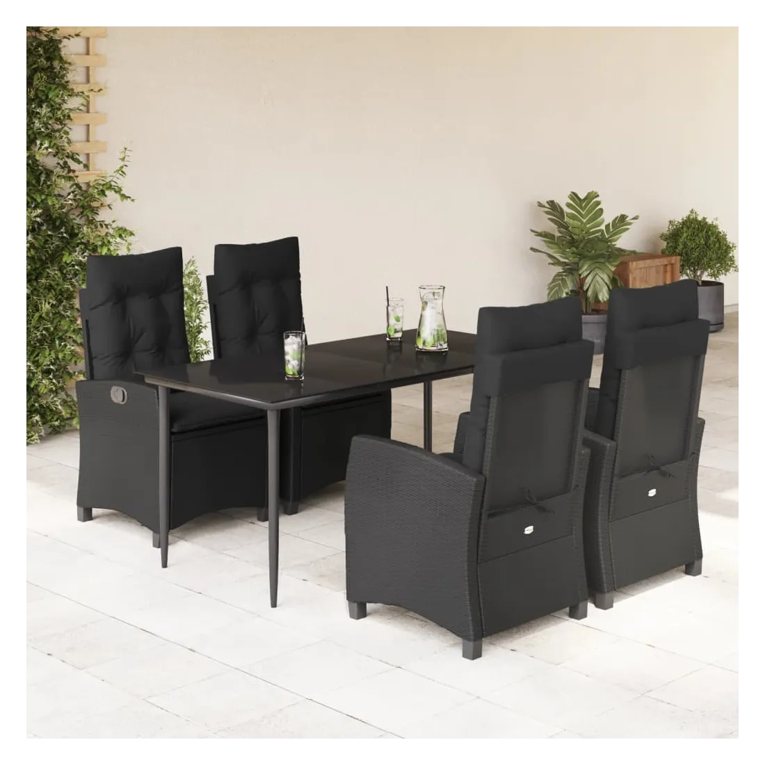 Cet ensemble de salle à manger de jardin est un excellent choix pour les repas en plein air ou pour vous détendre dans le jardin, l'arrière-cour ou le patio. Matériau durable : la résine tressée, également connue sous le nom de poly rotin, est un matériau synthétique solide et nécessitant peu d'entretien qui ressemble au rotin naturel. Il est léger, facile à nettoyer et couramment utilisé pour les meubles d'extérieur en raison de sa durabilité et de ses propriétés de résistance aux intempéries. Dossier réglable : ce siège de jardin est doté d'une poignée. Vous pouvez régler le dossier dans n'importe quelle position en tirant sur la poignée et le remettre rapidement dans sa position initiale.Dessus en verre : le dessus de la table d'extérieur est fabriqué en verre trempé solide et durable, ce qui le rend facile à nettoyer avec un chiffon humide et ajoute une touche d'élégance à votre espace extérieur. Expérience d'assise confortable : ce mobilier d'extérieur, doté de coussins épais, offre une expérience d'assise confortable. Housse amovible et lavable : ces coussins de siège sont dotés de housses amovibles pour un lavage et un entretien faciles. Bon à savoir :Pour que vos meubles d'extérieur restent beaux, nous vous recommandons de les protéger avec une housse imperméable.