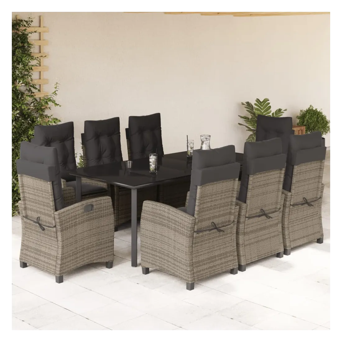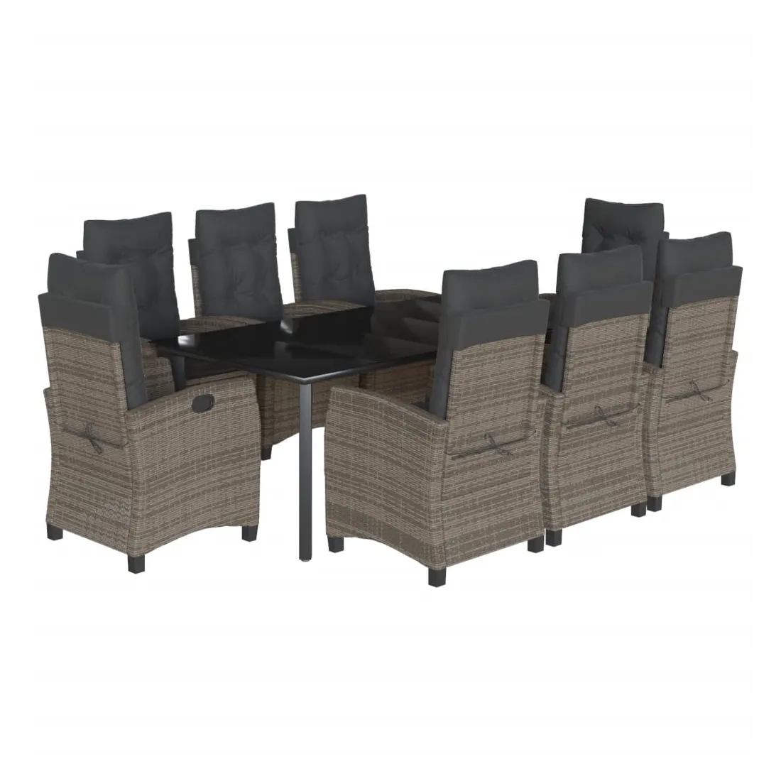 Cet ensemble de salle à manger de jardin est un excellent choix pour les repas en plein air ou pour vous détendre dans le jardin, l'arrière-cour ou le patio. Matériau durable : la résine tressée, également connue sous le nom de poly rotin, est un matériau synthétique solide et nécessitant peu d'entretien qui ressemble au rotin naturel. Il est léger, facile à nettoyer et couramment utilisé pour les meubles d'extérieur en raison de sa durabilité et de ses propriétés de résistance aux intempéries. Dossier réglable : ce siège de jardin est doté d'une poignée. Vous pouvez régler le dossier dans n'importe quelle position en tirant sur la poignée et le remettre rapidement dans sa position initiale.Dessus en verre : le dessus de la table d'extérieur est fabriqué en verre trempé solide et durable, ce qui le rend facile à nettoyer avec un chiffon humide et ajoute une touche d'élégance à votre espace extérieur. Expérience d'assise confortable : ce mobilier d'extérieur, doté de coussins épais, offre une expérience d'assise confortable. Housse amovible et lavable : ces coussins de siège sont dotés de housses amovibles pour un lavage et un entretien faciles. Bon à savoir :Pour que vos meubles d'extérieur restent beaux, nous vous recommandons de les protéger avec une housse imperméable.