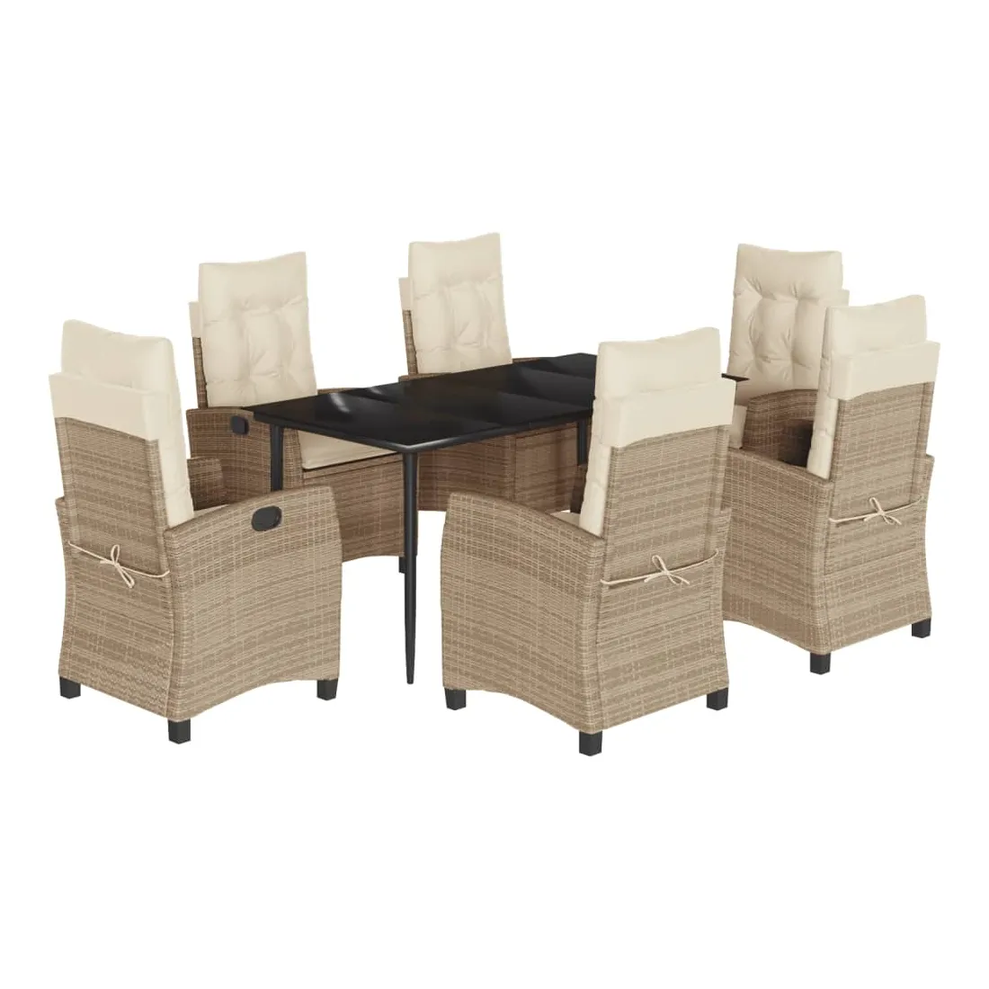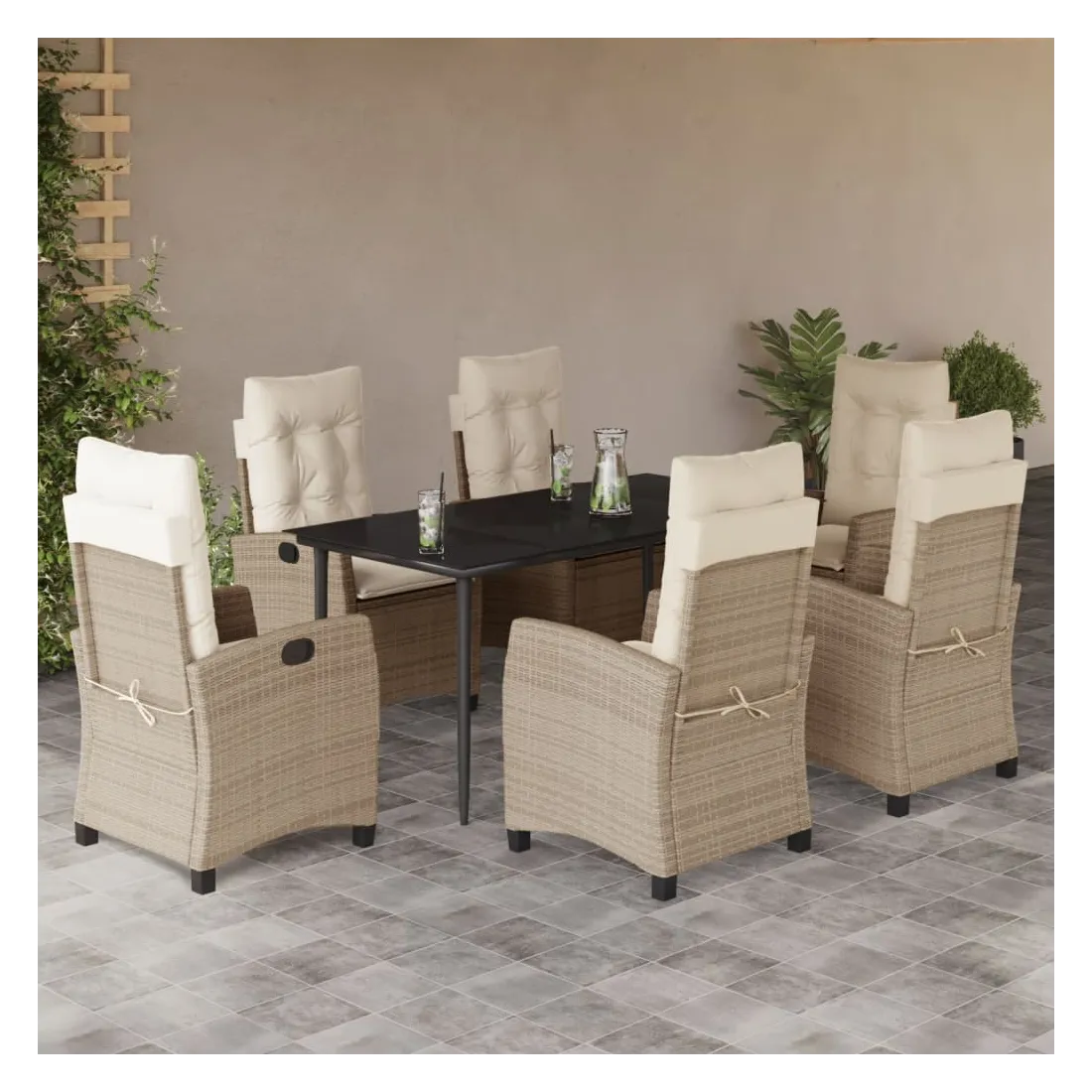 Cet ensemble de salle à manger de jardin est un excellent choix pour les repas en plein air ou pour vous détendre dans le jardin, l'arrière-cour ou le patio. Matériau durable : la résine tressée, également connue sous le nom de poly rotin, est un matériau synthétique solide et nécessitant peu d'entretien qui ressemble au rotin naturel. Il est léger, facile à nettoyer et couramment utilisé pour les meubles d'extérieur en raison de sa durabilité et de ses propriétés de résistance aux intempéries. Dossier réglable : ce siège de jardin est doté d'une poignée. Vous pouvez régler le dossier dans n'importe quelle position en tirant sur la poignée et le remettre rapidement dans sa position initiale.Dessus en verre : le dessus de la table d'extérieur est fabriqué en verre trempé solide et durable, ce qui le rend facile à nettoyer avec un chiffon humide et ajoute une touche d'élégance à votre espace extérieur. Expérience d'assise confortable : ce mobilier d'extérieur, doté de coussins épais, offre une expérience d'assise confortable. Housse amovible et lavable : ces coussins de siège sont dotés de housses amovibles pour un lavage et un entretien faciles. Bon à savoir :Pour que vos meubles d'extérieur restent beaux, nous vous recommandons de les protéger avec une housse imperméable.