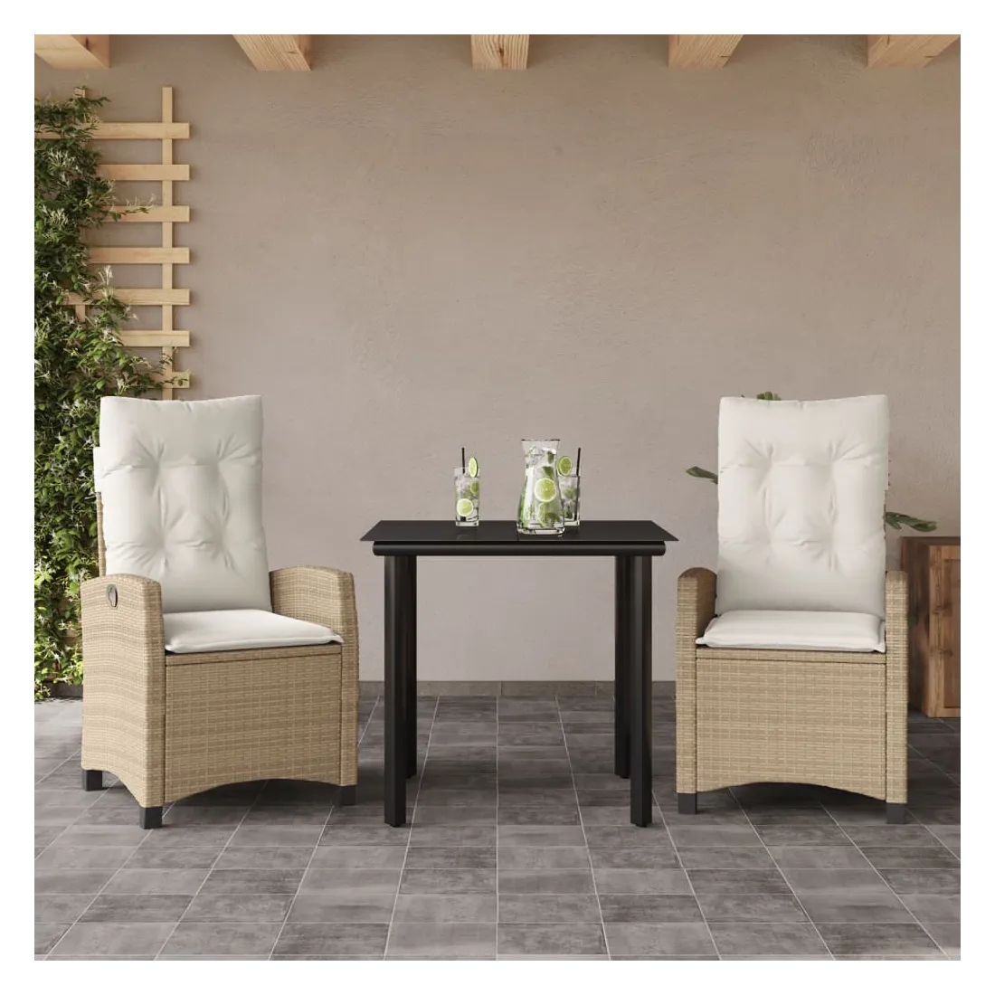 Cet ensemble de salle à manger de jardin est un excellent choix pour les repas en plein air ou pour vous détendre dans le jardin, l'arrière-cour ou le patio. Matériau durable : la résine tressée, également connue sous le nom de poly rotin, est un matériau synthétique solide et nécessitant peu d'entretien qui ressemble au rotin naturel. Il est léger, facile à nettoyer et couramment utilisé pour les meubles d'extérieur en raison de sa durabilité et de ses propriétés de résistance aux intempéries. Dossier réglable : ce siège de jardin est doté d'une poignée. Vous pouvez régler le dossier dans n'importe quelle position en tirant sur la poignée et le remettre rapidement dans sa position initiale.Dessus en verre : le dessus de la table d'extérieur est fabriqué en verre trempé solide et durable, ce qui le rend facile à nettoyer avec un chiffon humide et ajoute une touche d'élégance à votre espace extérieur. Expérience d'assise confortable : ce mobilier d'extérieur, doté de coussins épais, offre une expérience d'assise confortable. Housse amovible et lavable : ces coussins de siège sont dotés de housses amovibles pour un lavage et un entretien faciles. Bon à savoir :Pour que vos meubles d'extérieur restent beaux, nous vous recommandons de les protéger avec une housse imperméable.