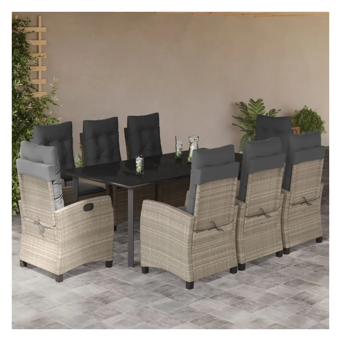 Cet ensemble de salle à manger de jardin est un excellent choix pour les repas en plein air ou pour vous détendre dans le jardin, l'arrière-cour ou le patio. Matériau durable : la résine tressée, également connue sous le nom de poly rotin, est un matériau synthétique solide et nécessitant peu d'entretien qui ressemble au rotin naturel. Il est léger, facile à nettoyer et couramment utilisé pour les meubles d'extérieur en raison de sa durabilité et de ses propriétés de résistance aux intempéries. Dossier réglable : ce siège de jardin est doté d'une poignée. Vous pouvez régler le dossier dans n'importe quelle position en tirant sur la poignée et le remettre rapidement dans sa position initiale.Dessus en verre : le dessus de la table d'extérieur est fabriqué en verre trempé solide et durable, ce qui le rend facile à nettoyer avec un chiffon humide et ajoute une touche d'élégance à votre espace extérieur. Expérience d'assise confortable : ce mobilier d'extérieur, doté de coussins épais, offre une expérience d'assise confortable. Housse amovible et lavable : ces coussins de siège sont dotés de housses amovibles pour un lavage et un entretien faciles. Bon à savoir :Pour que vos meubles d'extérieur restent beaux, nous vous recommandons de les protéger avec une housse imperméable.