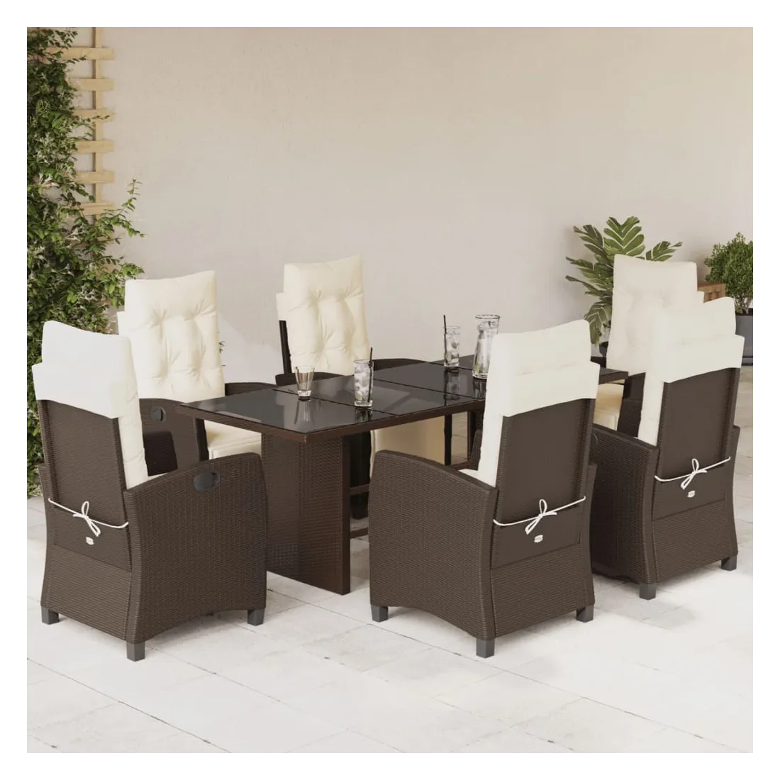 Cet ensemble de salle à manger de jardin est un excellent choix pour les repas en plein air ou pour vous détendre dans le jardin, l'arrière-cour ou le patio. Matériau durable : la résine tressée, également connue sous le nom de poly rotin, est un matériau synthétique solide et nécessitant peu d'entretien qui ressemble au rotin naturel. Il est léger, facile à nettoyer et couramment utilisé pour les meubles d'extérieur en raison de sa durabilité et de ses propriétés de résistance aux intempéries.Dossier et repose-pied réglables : ce siège de jardin est doté d'une poignée. Vous pouvez régler le dossier et le repose-pied dans n'importe quelle position en tirant sur la poignée, et les remettre rapidement dans leur position initiale.Dessus en verre : le dessus de la table d'extérieur est fabriqué en verre trempé solide et durable, ce qui le rend facile à nettoyer avec un chiffon humide et ajoute une touche d'élégance à votre espace extérieur.Expérience d'assise confortable : ce mobilier d'extérieur, doté de coussins épais, offre une expérience d'assise confortable.Housse amovible et lavable : ces coussins de siège sont dotés de housses amovibles pour un lavage et un entretien faciles. Bon à savoir :Pour que vos meubles d'extérieur restent beaux, nous vous recommandons de les protéger avec une housse imperméable.