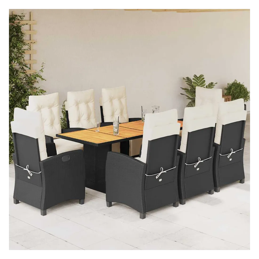 Cet ensemble de salle à manger de jardin est un excellent choix pour les repas en plein air ou pour vous détendre dans le jardin, l'arrière-cour ou le patio. Matériau durable : la résine tressée, également connue sous le nom de poly rotin, est un matériau synthétique solide et nécessitant peu d'entretien qui ressemble au rotin naturel. Il est léger, facile à nettoyer et couramment utilisé pour les meubles d'extérieur en raison de sa durabilité et de ses propriétés de résistance aux intempéries.Dossier et repose-pied réglables : ce siège de jardin est doté d'une poignée. Vous pouvez régler le dossier et le repose-pied dans n'importe quelle position en tirant sur la poignée, et les remettre rapidement dans leur position initiale.Dessus stable et facile à nettoyer : cette table de jardin a un dessus en bois d'acacia robuste, durable et facile à nettoyer avec un chiffon humide.Expérience d'assise confortable : ce mobilier d'extérieur, doté de coussins épais, offre une expérience d'assise confortable.Housse amovible et lavable : ces coussins de siège sont dotés de housses amovibles pour un lavage et un entretien faciles. Bon à savoir :Pour que vos meubles d'extérieur restent beaux, nous vous recommandons de les protéger avec une housse imperméable.