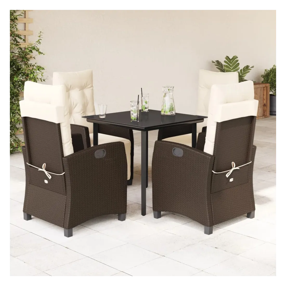 vidaXLCet ensemble de salle à manger de jardin est un excellent choix pour les repas en plein air ou pour vous détendre dans le jardin, l'arrière-cour ou le patio. Matériau durable : la résine tressée, également connue sous le nom de poly rotin, est un matériau synthétique solide et nécessitant peu d'entretien qui ressemble au rotin naturel. Il est léger, facile à nettoyer et couramment utilisé pour les meubles d'extérieur en raison de sa durabilité et de ses propriétés de résistance aux intempéries.Dossier et repose-pied réglables : ce siège de jardin est doté d'une poignée. Vous pouvez régler le dossier et le repose-pied dans n'importe quelle position en tirant sur la poignée, et les remettre rapidement dans leur position initiale.Dessus en verre : le dessus de la table d'extérieur est fabriqué en verre trempé solide et durable, ce qui le rend facile à nettoyer avec un chiffon humide et ajoute une touche d'élégance à votre espace extérieur.Expérience d'assise confortable : ce mobilier d'extérieur, doté de coussins épais, offre une expérience d'assise confortable.Housse amovible et lavable : ces coussins de siège sont dotés de housses amovibles pour un lavage et un entretien faciles. Bon à savoir :Pour que vos meubles d'extérieur restent beaux, nous vous recommandons de les protéger avec une housse imperméable.