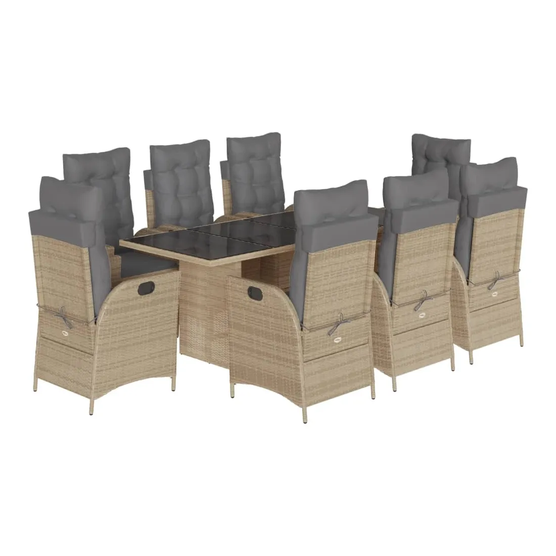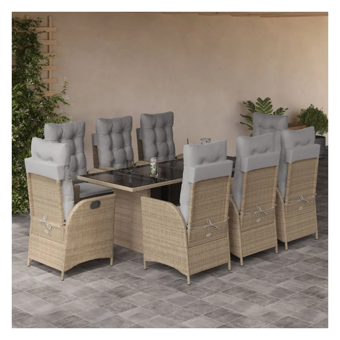 Cet ensemble de salle à manger de jardin est un excellent choix pour les repas en plein air ou pour vous détendre dans le jardin, dans l'arrière-cour ou sur la terrasse. Matériau durable : la résine tressée, également connue sous le nom de poly rotin, est un matériau synthétique solide et nécessitant peu d'entretien qui ressemble au rotin naturel. Il est léger, facile à nettoyer et couramment utilisé pour les meubles d'extérieur en raison de sa durabilité et de ses propriétés de résistance aux intempéries.Dossier réglable : ce siège de jardin est doté d'une poignée. Vous pouvez régler le dossier dans n'importe quelle position en tirant sur la poignée et le remettre rapidement dans sa position initiale.Expérience d'assise confortable : ce mobilier d'extérieur, doté de coussins épais, offre une expérience d'assise confortable.Housse amovible et lavable : ces coussins de siège sont dotés de housses amovibles pour un lavage et un entretien faciles. Les coussins de dossier ont un rabat à l'arrière pour une fixation facile aux dossiers.Dessus en verre : le dessus de la table d'extérieur est fabriqué en verre trempé solide et durable, ce qui le rend facile à nettoyer avec un chiffon humide et ajoute une touche d'élégance à votre espace extérieur. Bon à savoir : Pour que vos meubles d'extérieur restent beaux, nous vous recommandons de les protéger avec une housse imperméable.