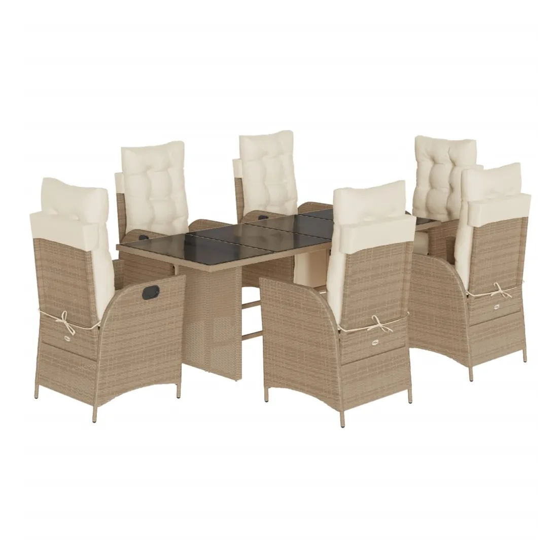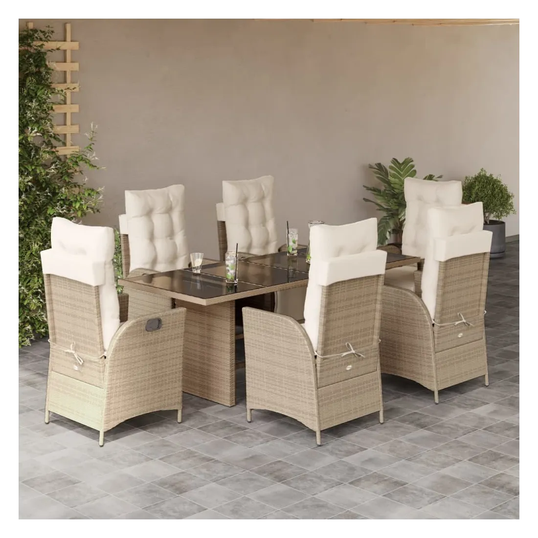 Cet ensemble de salle à manger de jardin est un excellent choix pour les repas en plein air ou pour vous détendre dans le jardin, l'arrière-cour ou le patio. Matériau durable : la résine tressée, également connue sous le nom de poly rotin, est un matériau synthétique solide et nécessitant peu d'entretien qui ressemble au rotin naturel. Il est léger, facile à nettoyer et couramment utilisé pour les meubles d'extérieur en raison de sa durabilité et de ses propriétés de résistance aux intempéries.Dossier et repose-pied réglables : ce siège de jardin est doté d'une poignée. Vous pouvez régler le dossier et le repose-pied dans n'importe quelle position en tirant sur la poignée, et les remettre rapidement dans leur position initiale.Expérience d'assise confortable : ce mobilier d'extérieur, doté de coussins épais, offre une expérience d'assise confortable.Housse amovible et lavable : ces coussins de siège sont dotés de housses amovibles pour un lavage et un entretien faciles. Les coussins de dossier ont un rabat à l'arrière pour une fixation facile aux dossiers.Dessus en verre : le dessus de la table d'extérieur est fabriqué en verre trempé solide et durable, ce qui le rend facile à nettoyer avec un chiffon humide et ajoute une touche d'élégance à votre espace extérieur. Bon à savoir :Pour que vos meubles d'extérieur restent beaux, nous vous recommandons de les protéger avec une housse imperméable.