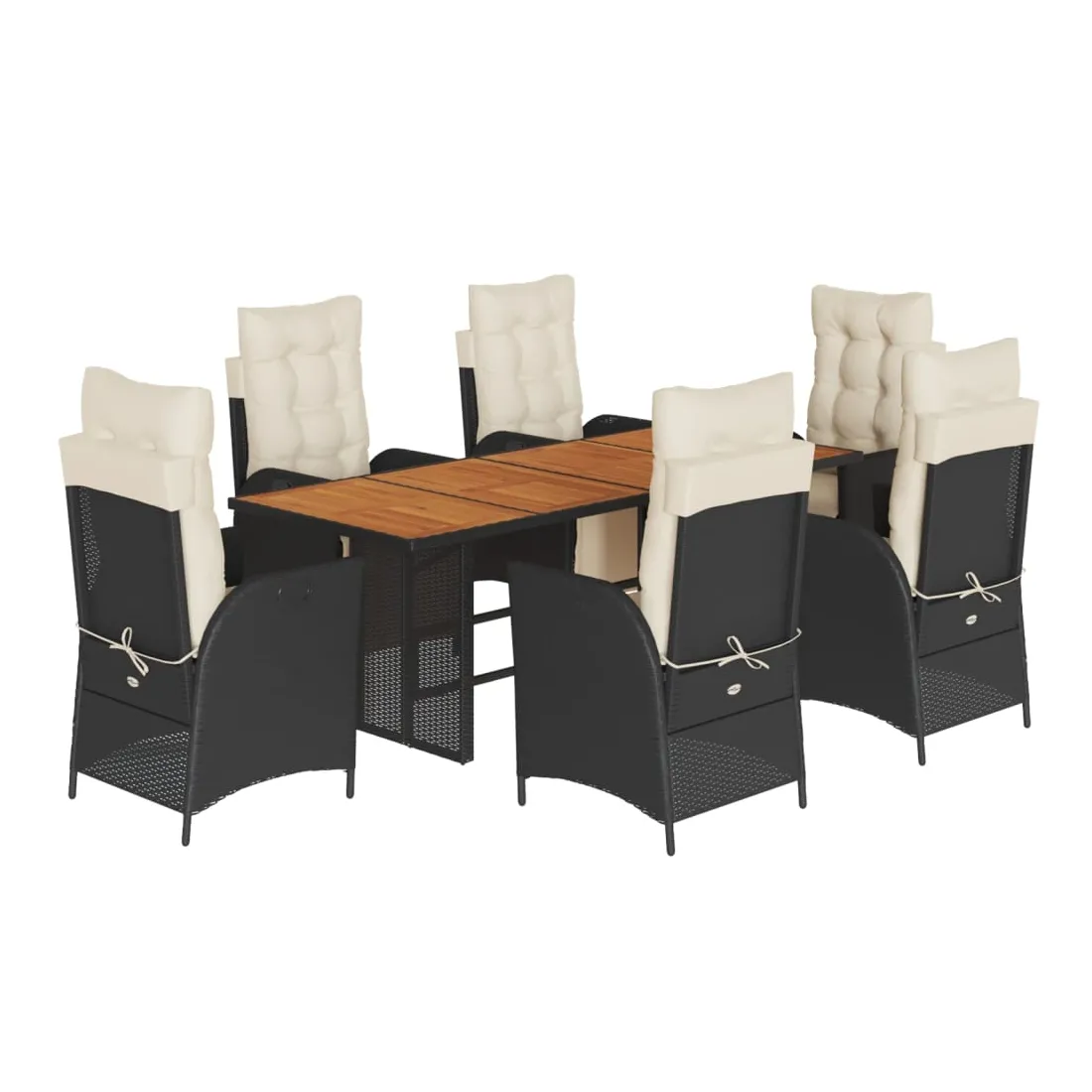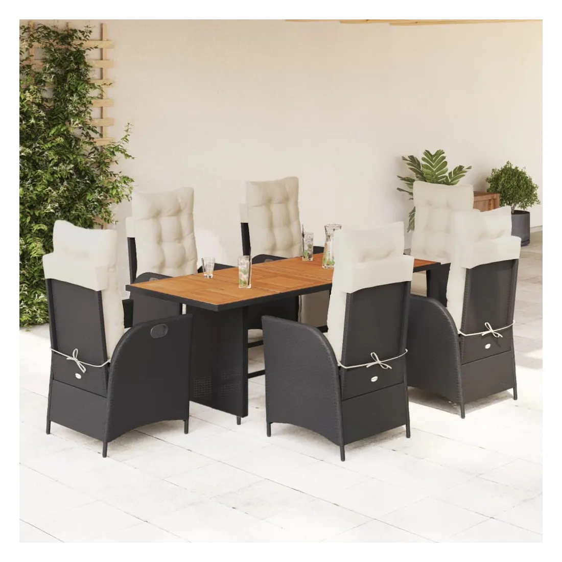 Cet ensemble de salle à manger de jardin est un excellent choix pour les repas en plein air ou pour vous détendre dans le jardin, l'arrière-cour ou le patio. Matériau durable : la résine tressée, également connue sous le nom de poly rotin, est un matériau synthétique solide et nécessitant peu d'entretien qui ressemble au rotin naturel. Il est léger, facile à nettoyer et couramment utilisé pour les meubles d'extérieur en raison de sa durabilité et de ses propriétés de résistance aux intempéries.Dossier et repose-pied réglables : ce siège de jardin est doté d'une poignée. Vous pouvez régler le dossier et le repose-pied dans n'importe quelle position en tirant sur la poignée, et les remettre rapidement dans leur position initiale.Expérience d'assise confortable : ce mobilier d'extérieur, doté de coussins épais, offre une expérience d'assise confortable.Housse amovible et lavable : ces coussins de siège sont dotés de housses amovibles pour un lavage et un entretien faciles. Les coussins de dossier ont un rabat à l'arrière pour une fixation facile aux dossiers.Dessus stable et facile à nettoyer : cette table de jardin a un dessus en bois d'acacia robuste, durable et facile à nettoyer avec un chiffon humide. Bon à savoir :Pour que vos meubles d'extérieur restent beaux, nous vous recommandons de les protéger avec une housse imperméable.
