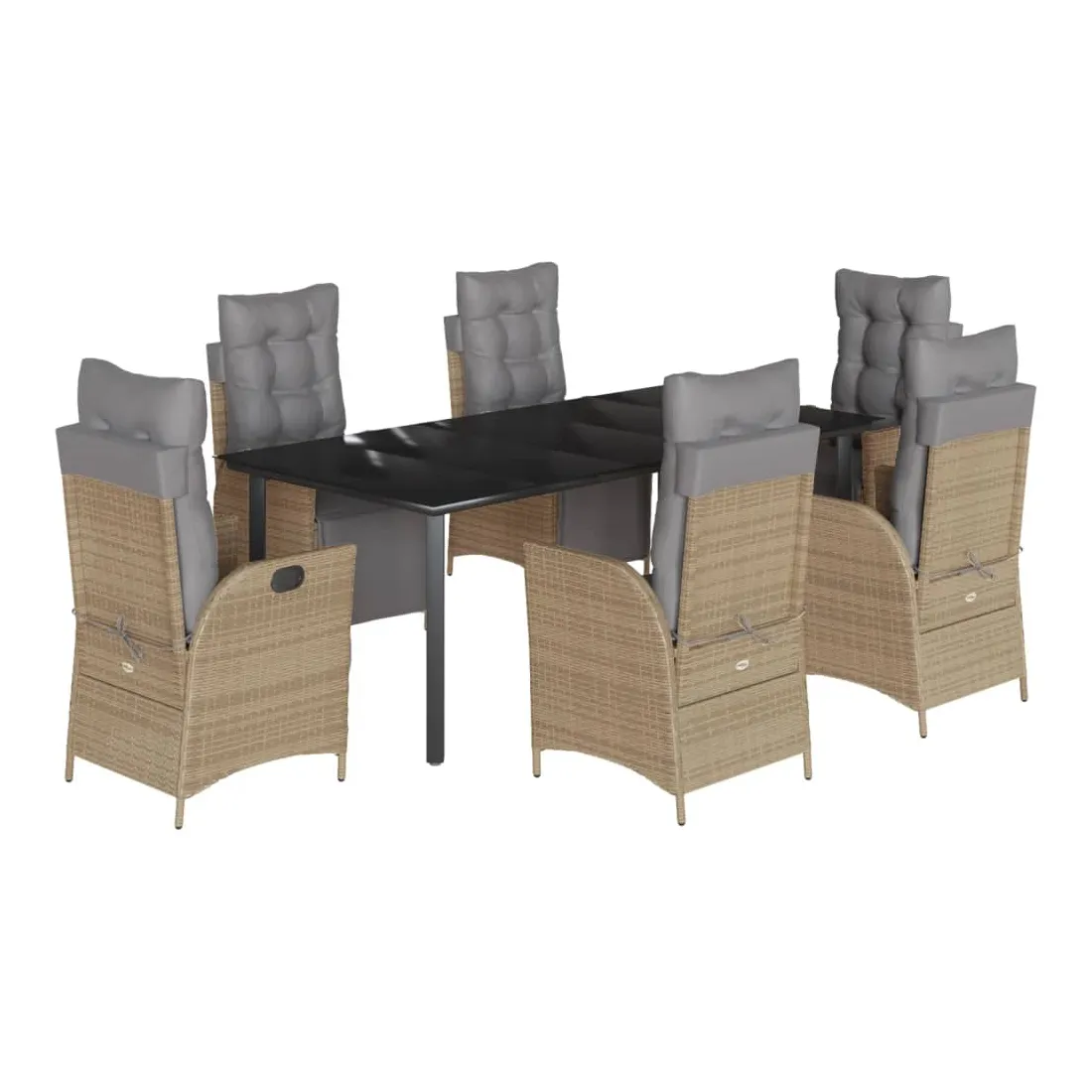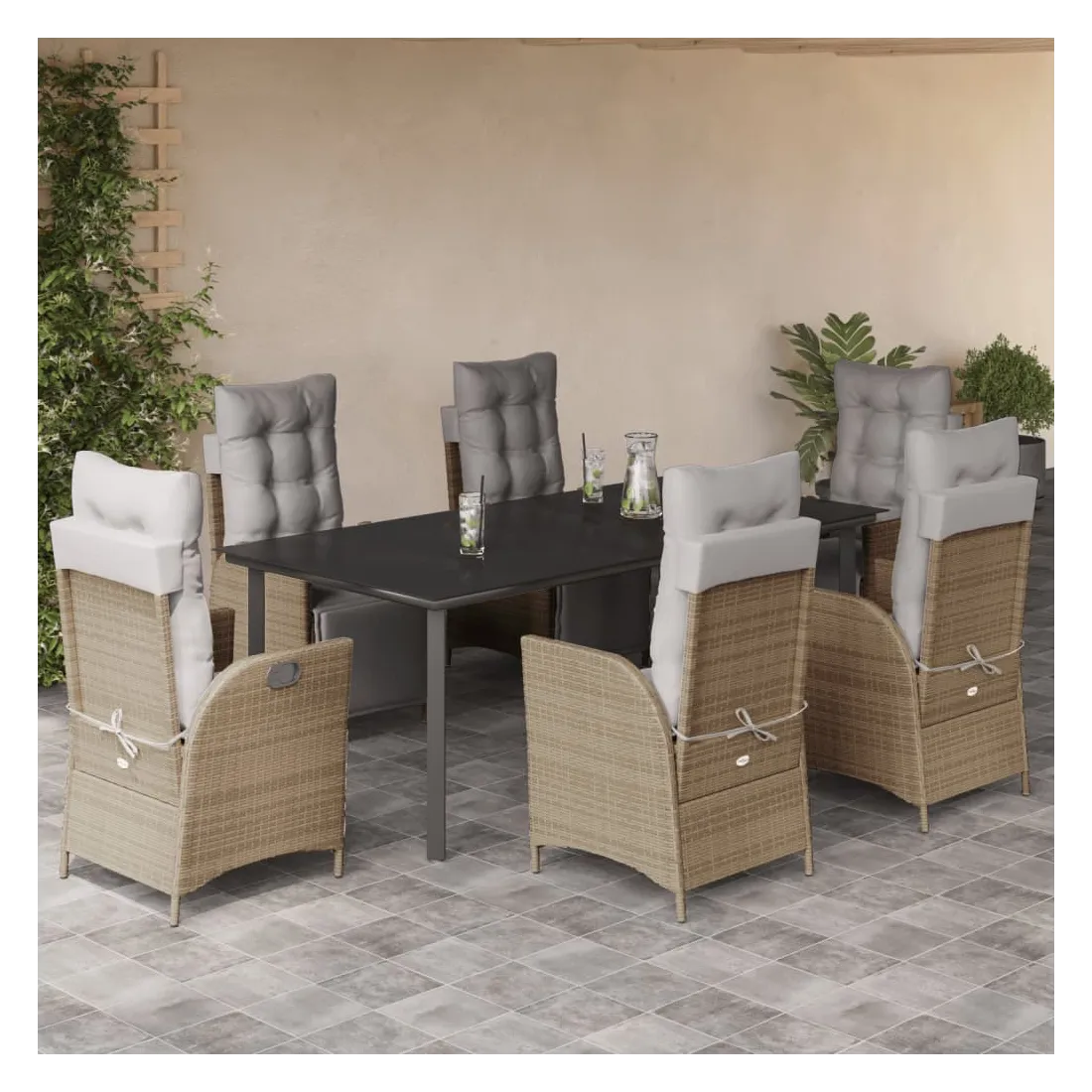 Cet ensemble de salle à manger de jardin est un excellent choix pour les repas en plein air ou pour vous détendre dans le jardin, l'arrière-cour ou le patio. Matériau durable : la résine tressée, également connue sous le nom de poly rotin, est un matériau synthétique solide et nécessitant peu d'entretien qui ressemble au rotin naturel. Il est léger, facile à nettoyer et couramment utilisé pour les meubles d'extérieur en raison de sa durabilité et de ses propriétés de résistance aux intempéries.Dossier et repose-pied réglables : ce siège de jardin est doté d'une poignée. Vous pouvez régler le dossier et le repose-pied dans n'importe quelle position en tirant sur la poignée, et les remettre rapidement dans leur position initiale.Expérience d'assise confortable : ce mobilier d'extérieur, doté de coussins épais, offre une expérience d'assise confortable.Housse amovible et lavable : ces coussins de siège sont dotés de housses amovibles pour un lavage et un entretien faciles. Les coussins de dossier ont un rabat à l'arrière pour une fixation facile aux dossiers.Dessus en verre : le dessus de la table d'extérieur est fabriqué en verre trempé solide et durable, ce qui le rend facile à nettoyer avec un chiffon humide et ajoute une touche d'élégance à votre espace extérieur. Bon à savoir :Pour que vos meubles d'extérieur restent beaux, nous vous recommandons de les protéger avec une housse imperméable.