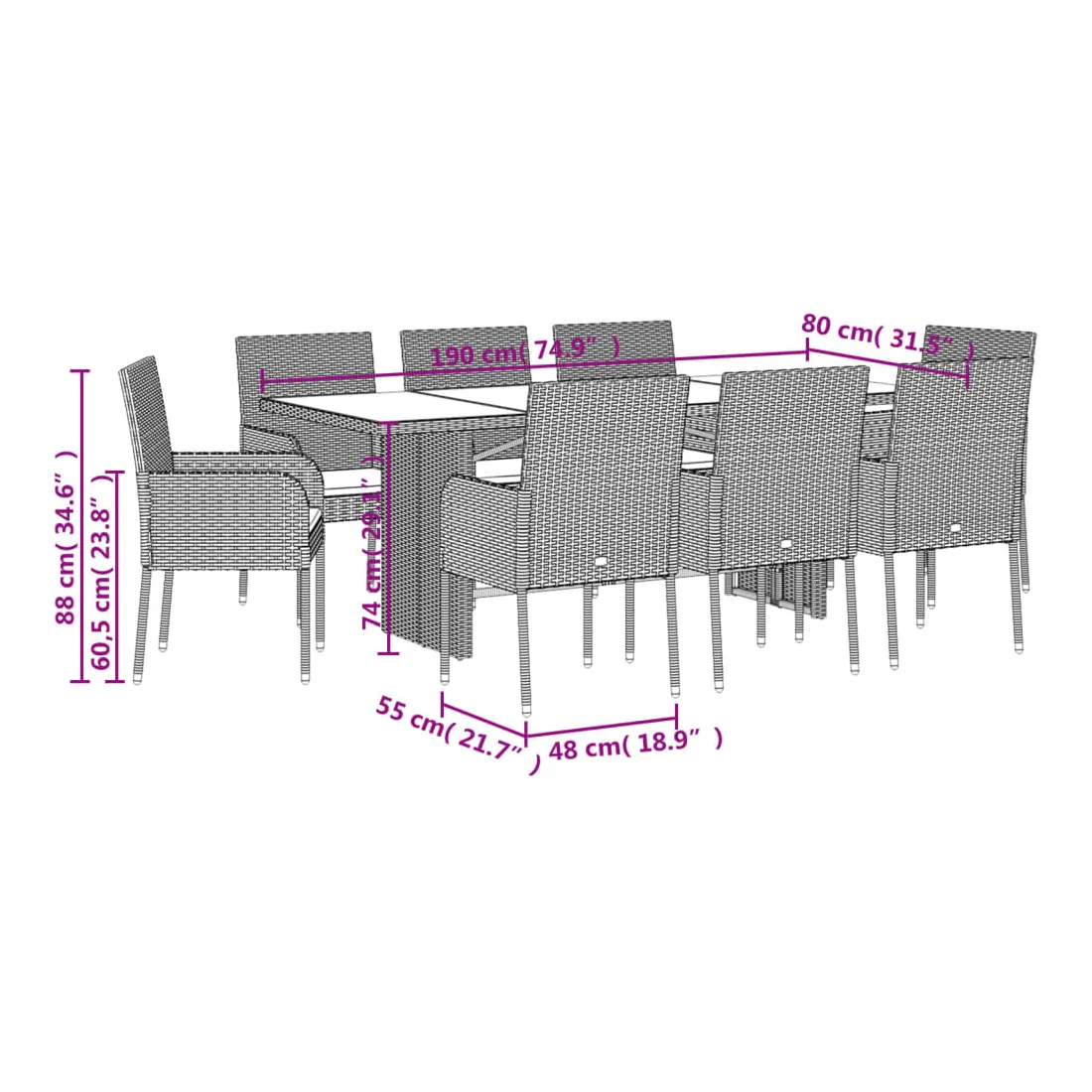 - Dimensions : 190 x 80 x 74 cm (L x l x H)