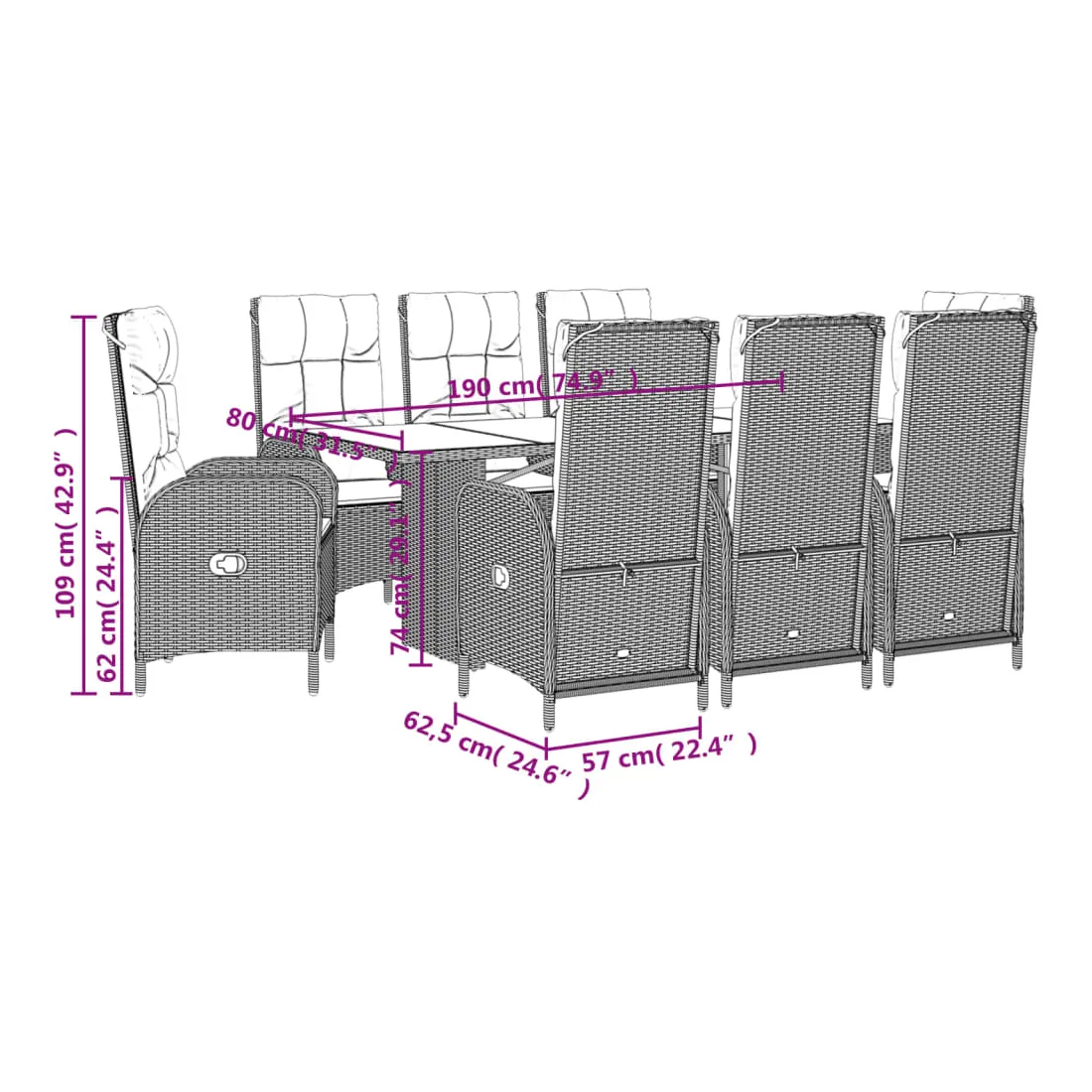 - Dimensions : 190 x 80 x 74 cm (L x l x H)