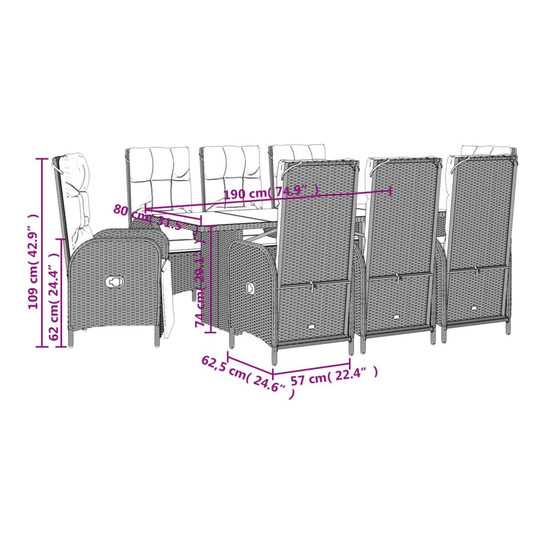 - Dimensions : 190 x 80 x 74 cm (L x l x H)