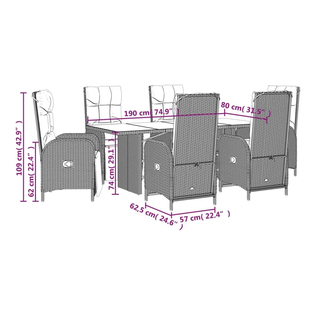 - Dimensions : 190 x 80 x 74 cm (L x l x H)