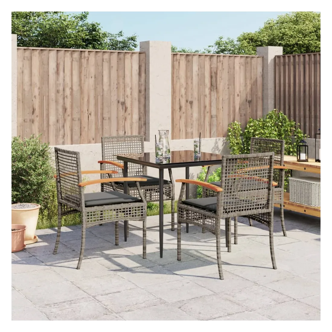 Cet ensemble de salle à manger de jardin est un excellent choix pour les repas en plein air ou pour vous détendre dans le jardin, dans l'arrière-cour ou sur la terrasse. Matériau durable : la résine tressée, également connue sous le nom de poly rotin, est un matériau synthétique solide et nécessitant peu d'entretien qui ressemble au rotin naturel. Il est léger, facile à nettoyer et couramment utilisé pour les meubles d'extérieur en raison de sa durabilité et de ses propriétés de résistance aux intempéries.Expérience d'assise confortable : ce mobilier d'extérieur, doté de coussins épais, offre une expérience d'assise confortable.Housse amovible et lavable : ces coussins de siège sont dotés de housses amovibles pour un lavage et un entretien faciles.Dessus en verre : le dessus de la table d'extérieur est fabriqué en verre trempé solide et durable, ce qui le rend facile à nettoyer avec un chiffon humide et ajoute une touche d'élégance à votre espace extérieur.Cadre robuste et stable : le cadre en acier enduit de poudre assure la solidité et la stabilité du meuble de jardin pour une utilisation quotidienne à l'extérieur. Bon à savoir :Pour que vos meubles d'extérieur restent beaux, nous vous recommandons de les protéger avec une housse imperméable.