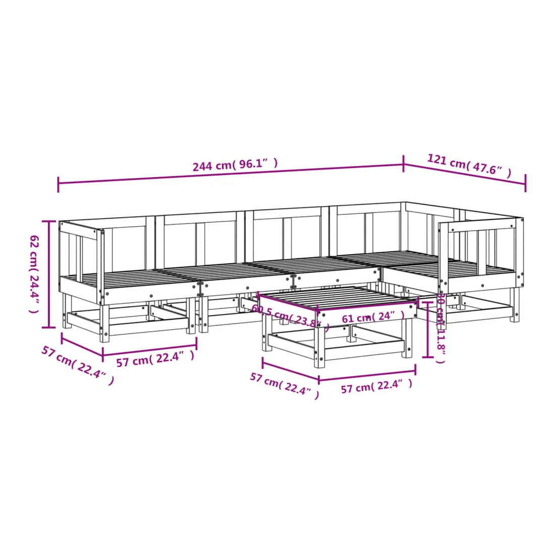 - Dimensions du canapé central : 61 x 60,5 x 62 cm (L x l x H)