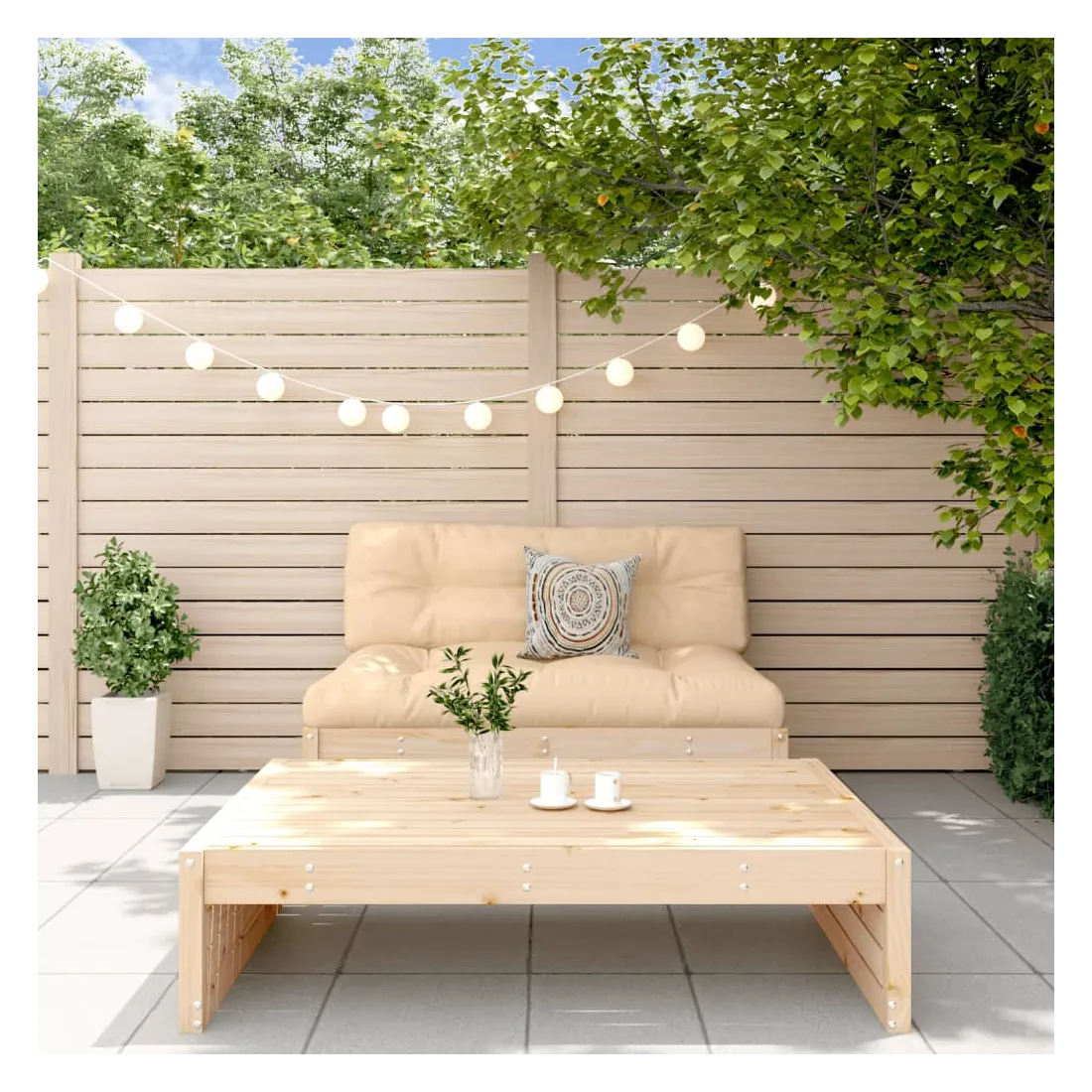Ce salon de jardin en bois, qui se démarque par son design à lattes, sera un excellent supplément à votre jardin, patio ou terrasse pour profiter d'un moment agréable avec votre famille ou vos amis. Bois de pin massif : le bois de pin massif est un matériau naturel magnifique. Le bois de pin a un grain droit et les nœuds donnent au matériau son aspect caractéristique et rustique.Cadre robuste et stable : le cadre en bois rend l'ensemble de salon robuste et stable pour une utilisation quotidienne à l'extérieur.Expérience d'assise confortable : le dossier ajoute un confort d'assise supplémentaire au canapé d'extérieur.Design modulaire : le canapé est flexible et facile à déplacer. Vous pouvez le combiner avec d'autres segments modulaires de la boutique en ligne pour créer vos propres configurations de salon de jardin ! Bon à savoir :Les coussins ne sont pas inclus dans la livraison.Pour que vos meubles d'extérieur restent beaux, nous vous recommandons de les protéger avec une housse imperméable.
