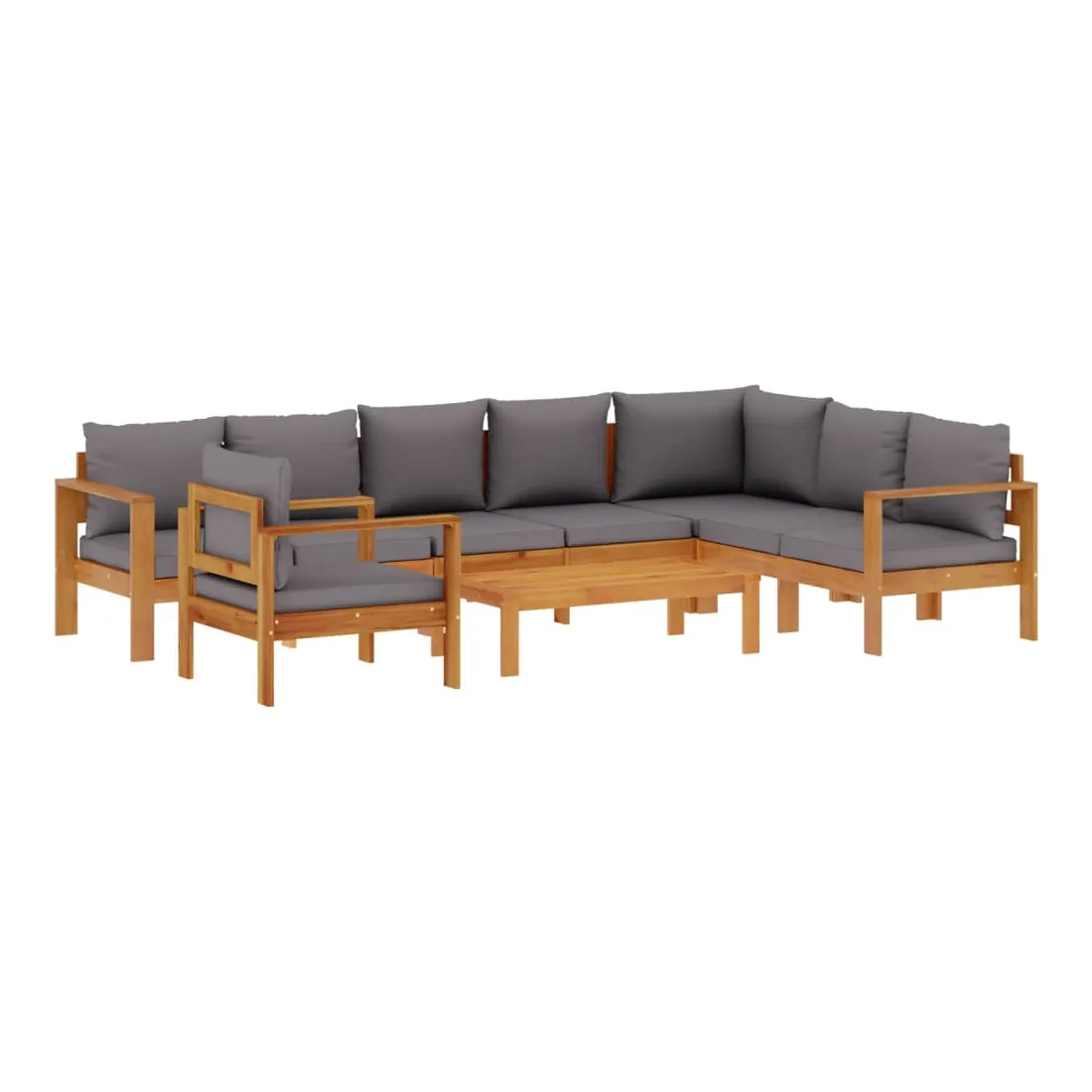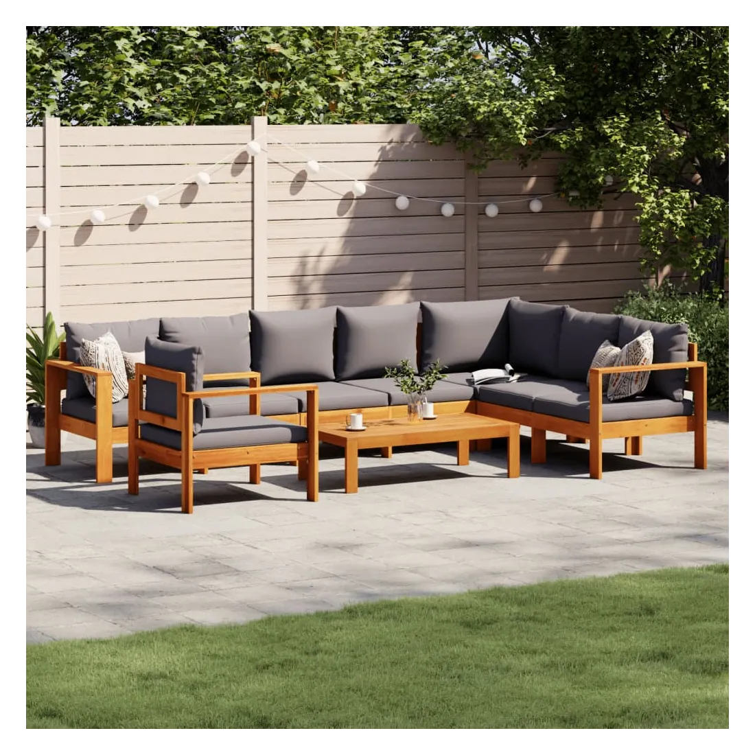 Cet ensemble de canapés de jardin est le complément parfait de votre arrière-cour, terrasse ou patio, offrant un espace confortable et accueillant pour discuter avec la famille et les amis ou simplement se détendre et profiter de l'extérieur. Matériau durable : le bois d'acacia massif est un matériau naturel magnifique. Le bois d'acacia un bois dur tropical, qui est dense, robuste et durable.Dessus stable et facile à nettoyer : cette table de jardin a un dessus en bois d'acacia robuste, durable et facile à nettoyer avec un chiffon humide.Expérience d'assise confortable : ce mobilier d'extérieur, doté de coussins épais, offre une expérience d'assise confortable. Housse amovible et lavable : ces coussins de siège sont dotés de housses amovibles pour un lavage et un entretien faciles.Conception modulaire : cet ensemble de meubles d'extérieur a une conception modulaire, ce qui le rend complètement flexible et facile à déplacer, afin que vous puissiez créer un agencement de meubles d'extérieur personnalisé. Bon à savoir :Pour que vos meubles d'extérieur restent beaux, nous vous recommandons de les protéger avec une housse imperméable.