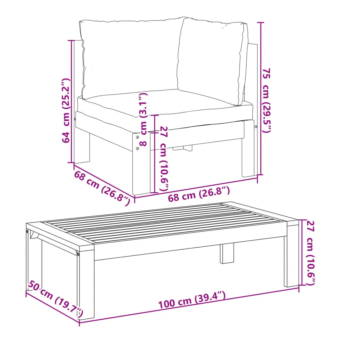 - Hauteur du siège à partir du sol (sans coussin) : 27 cm