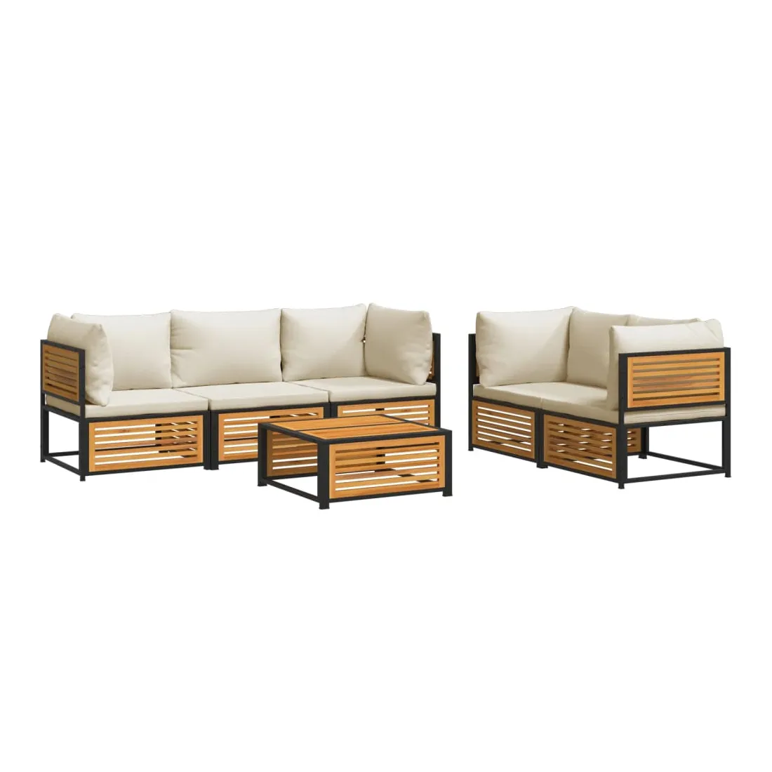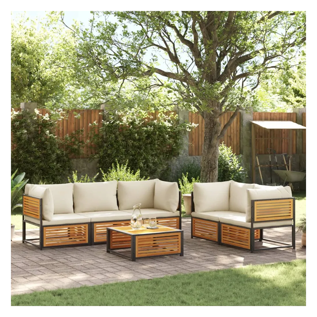 Cet ensemble de canapés de jardin est le complément parfait de votre arrière-cour, terrasse ou patio, offrant un espace confortable et accueillant pour discuter avec la famille et les amis ou simplement se détendre et profiter de l'extérieur. Cadre robuste et stable : le bois d'acacia massif est connu pour sa solidité et sa durabilité. Ses couleurs variées et ses grains uniques lui confèrent un aspect attrayant. Sa stabilité et sa résistance aux intempéries en font un matériau idéal pour la fabrication de meubles d'intérieur et d'extérieur. De plus, le cadre en acier enduit de poudre garantit la solidité et la stabilité du mobilier de jardin pour une utilisation quotidienne en extérieur. Dessus stable et facile à nettoyer : cette table de jardin a un dessus en bois d'acacia robuste, durable et facile à nettoyer avec un chiffon humide. Bonne ventilation et prévention de l'accumulation d'eau : la conception à lattes favorise une circulation optimale de l'air et empêche efficacement l'accumulation d'eau, assurant ainsi un mobilier de jardin sec et confortable.Expérience d'assise confortable : ce mobilier d'extérieur, doté de coussins épais, offre une expérience d'assise confortable. Housse amovible et lavable : ces coussins de siège sont dotés de housses amovibles pour un lavage et un entretien faciles. Bon à savoir :Pour que vos meubles d'extérieur restent beaux, nous vous recommandons de les protéger avec une housse imperméable.