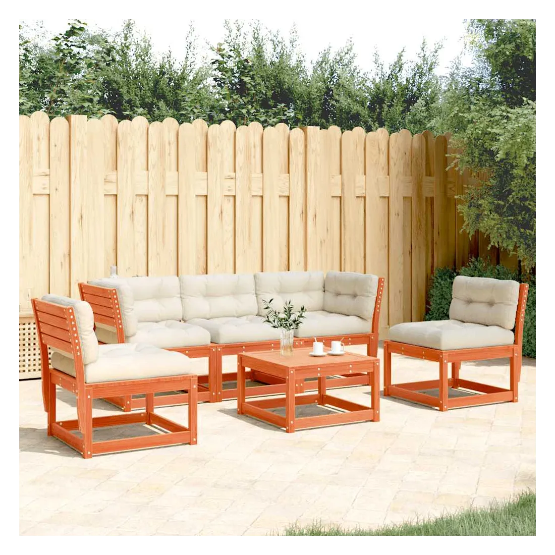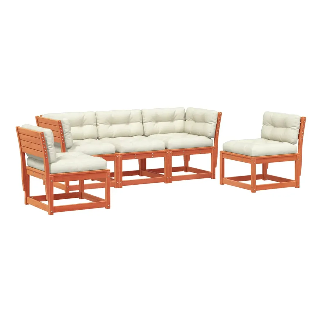 Cet ensemble de canapés de jardin est le complément parfait de votre arrière-cour, terrasse ou patio, offrant un espace confortable et accueillant pour discuter avec la famille et les amis ou simplement se détendre et profiter de l'extérieur. Bois de pin massif : le bois de pin massif est un matériau naturel magnifique. Le bois de pin a un grain droit et les nœuds donnent au matériau son aspect caractéristique et rustique.Expérience d'assise confortable : ce mobilier d'extérieur, doté de dossiers et de coussin épais rembourré, offre une expérience d'assise confortable.Conception à lattes : la conception à lattes du canapé d'extérieur empêche efficacement l'eau de s'accumuler, ce qui garantit que l'assise reste sèche et exempte de tout risque de pourriture.Conception modulaire : cet ensemble de meubles d'extérieur a une conception modulaire, ce qui le rend complètement flexible et facile à déplacer, afin que vous puissiez créer un agencement de meubles d'extérieur personnalisé. Bon à savoir :Pour que vos meubles d'extérieur restent beaux, nous vous recommandons de les protéger avec une housse imperméable.