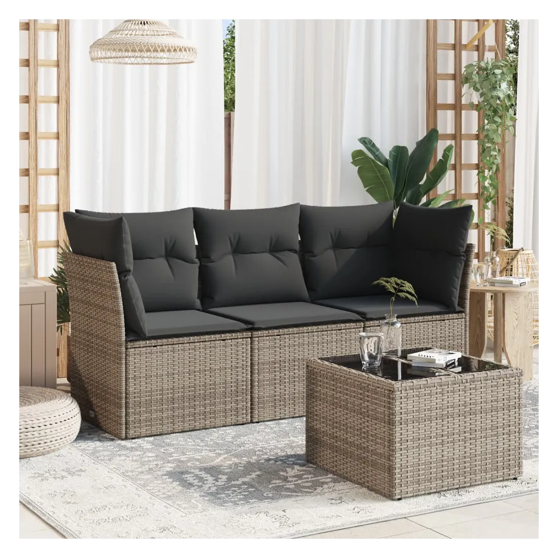 Cet ensemble de canapés de jardin est le complément parfait de votre arrière-cour, terrasse ou patio, offrant un espace confortable et accueillant pour discuter avec la famille et les amis ou simplement se détendre et profiter de l'extérieur. Matériau durable : la résine tressée, également connue sous le nom de poly rotin, est un matériau synthétique solide et nécessitant peu d'entretien qui ressemble au rotin naturel. Il est léger, facile à nettoyer et couramment utilisé pour les meubles d'extérieur en raison de sa durabilité et de ses propriétés de résistance aux intempéries.Expérience d'assise confortable : cet ensemble de meubles d'extérieur, doté de coussins épais, offre une expérience d'assise confortable.Housse amovible et lavable : ces coussins de siège sont dotés de housses amovibles pour un lavage et un entretien faciles.Dessus en verre : le dessus de la table d'extérieur est fabriqué en verre trempé solide et durable, ce qui le rend facile à nettoyer avec un chiffon humide et ajoute une touche d'élégance à votre espace extérieur.Conception modulaire : cet ensemble de meubles d'extérieur a une conception modulaire, ce qui le rend complètement flexible et facile à déplacer, afin que vous puissiez créer un agencement de meubles d'extérieur personnalisé. Bon à savoir :Pour que vos meubles d'extérieur restent beaux, nous vous recommandons de les protéger avec une housse imperméable.