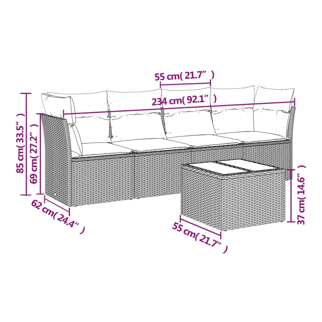 - Dimensions totales du canapé : 234 x 62 x 69 cm (l x P x H)