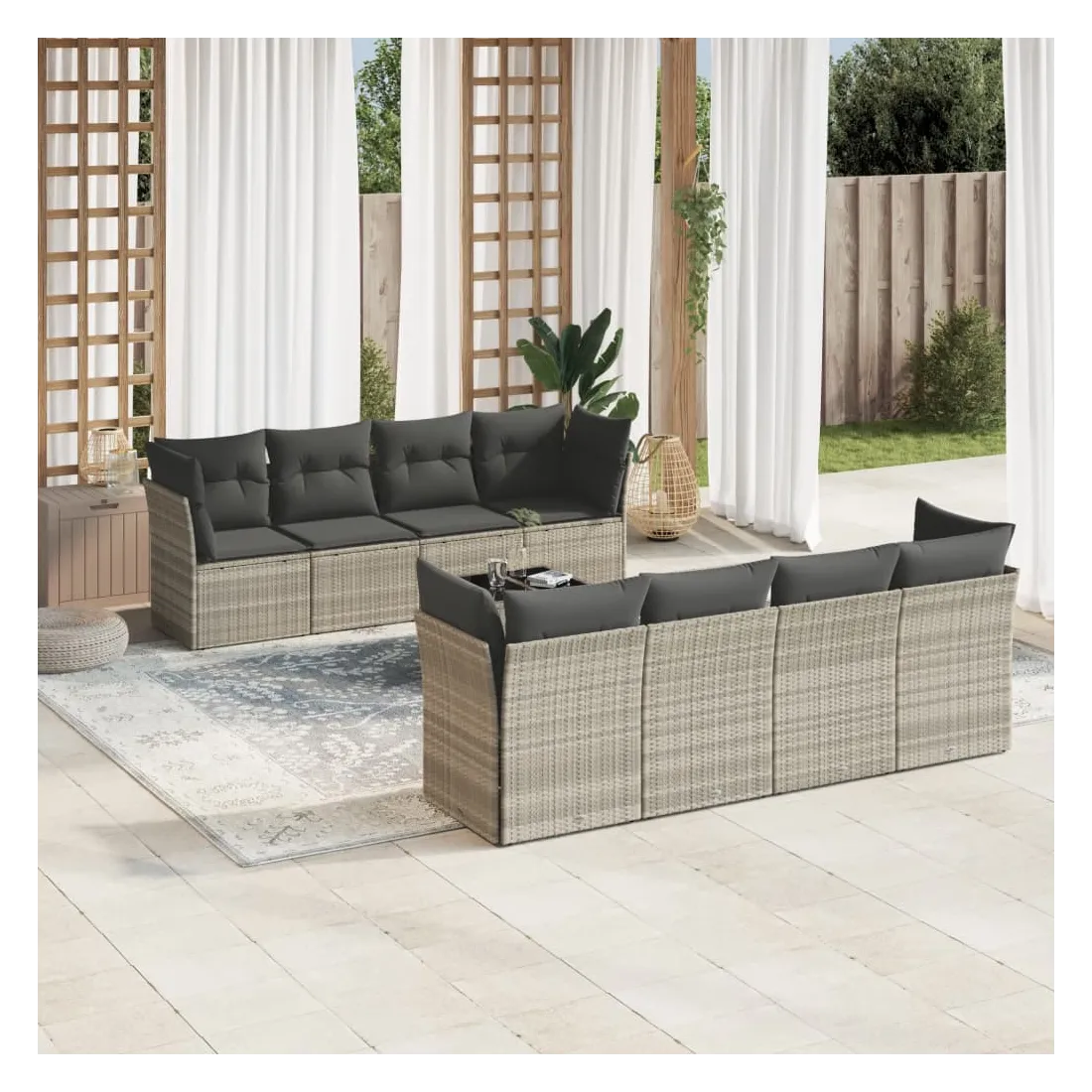 Cet ensemble de canapés de jardin est le complément parfait de votre arrière-cour, terrasse ou patio, offrant un espace confortable et accueillant pour discuter avec la famille et les amis ou simplement se détendre et profiter de l'extérieur. Matériau durable : la résine tressée, également connue sous le nom de poly rotin, est un matériau synthétique solide et nécessitant peu d'entretien qui ressemble au rotin naturel. Il est léger, facile à nettoyer et couramment utilisé pour les meubles d'extérieur en raison de sa durabilité et de ses propriétés de résistance aux intempéries.Expérience d'assise confortable : cet ensemble de meubles d'extérieur, doté de coussins épais, offre une expérience d'assise confortable.Housse amovible et lavable : ces coussins de siège sont dotés de housses amovibles pour un lavage et un entretien faciles.Dessus en verre : le dessus de la table d'extérieur est fabriqué en verre trempé solide et durable, ce qui le rend facile à nettoyer avec un chiffon humide et ajoute une touche d'élégance à votre espace extérieur.Conception modulaire : cet ensemble de meubles d'extérieur a une conception modulaire, ce qui le rend complètement flexible et facile à déplacer, afin que vous puissiez créer un agencement de meubles d'extérieur personnalisé. Bon à savoir :Pour que vos meubles d'extérieur restent beaux, nous vous recommandons de les protéger avec une housse imperméable.