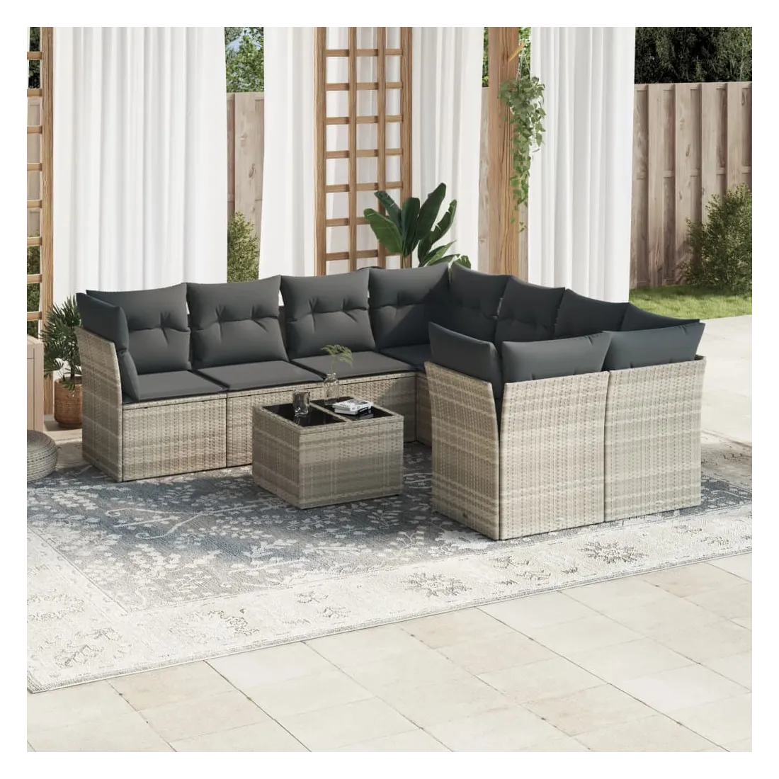 Cet ensemble de canapés de jardin est le complément parfait de votre arrière-cour, terrasse ou patio, offrant un espace confortable et accueillant pour discuter avec la famille et les amis ou simplement se détendre et profiter de l'extérieur. Matériau durable : la résine tressée, également connue sous le nom de poly rotin, est un matériau synthétique solide et nécessitant peu d'entretien qui ressemble au rotin naturel. Il est léger, facile à nettoyer et couramment utilisé pour les meubles d'extérieur en raison de sa durabilité et de ses propriétés de résistance aux intempéries.Expérience d'assise confortable : cet ensemble de meubles d'extérieur, doté de coussins épais, offre une expérience d'assise confortable.Housse amovible et lavable : ces coussins de siège sont dotés de housses amovibles pour un lavage et un entretien faciles.Dessus en verre : le dessus de la table d'extérieur est fabriqué en verre trempé solide et durable, ce qui le rend facile à nettoyer avec un chiffon humide et ajoute une touche d'élégance à votre espace extérieur.Conception modulaire : cet ensemble de meubles d'extérieur a une conception modulaire, ce qui le rend complètement flexible et facile à déplacer, afin que vous puissiez créer un agencement de meubles d'extérieur personnalisé. Bon à savoir :Pour que vos meubles d'extérieur restent beaux, nous vous recommandons de les protéger avec une housse imperméable.