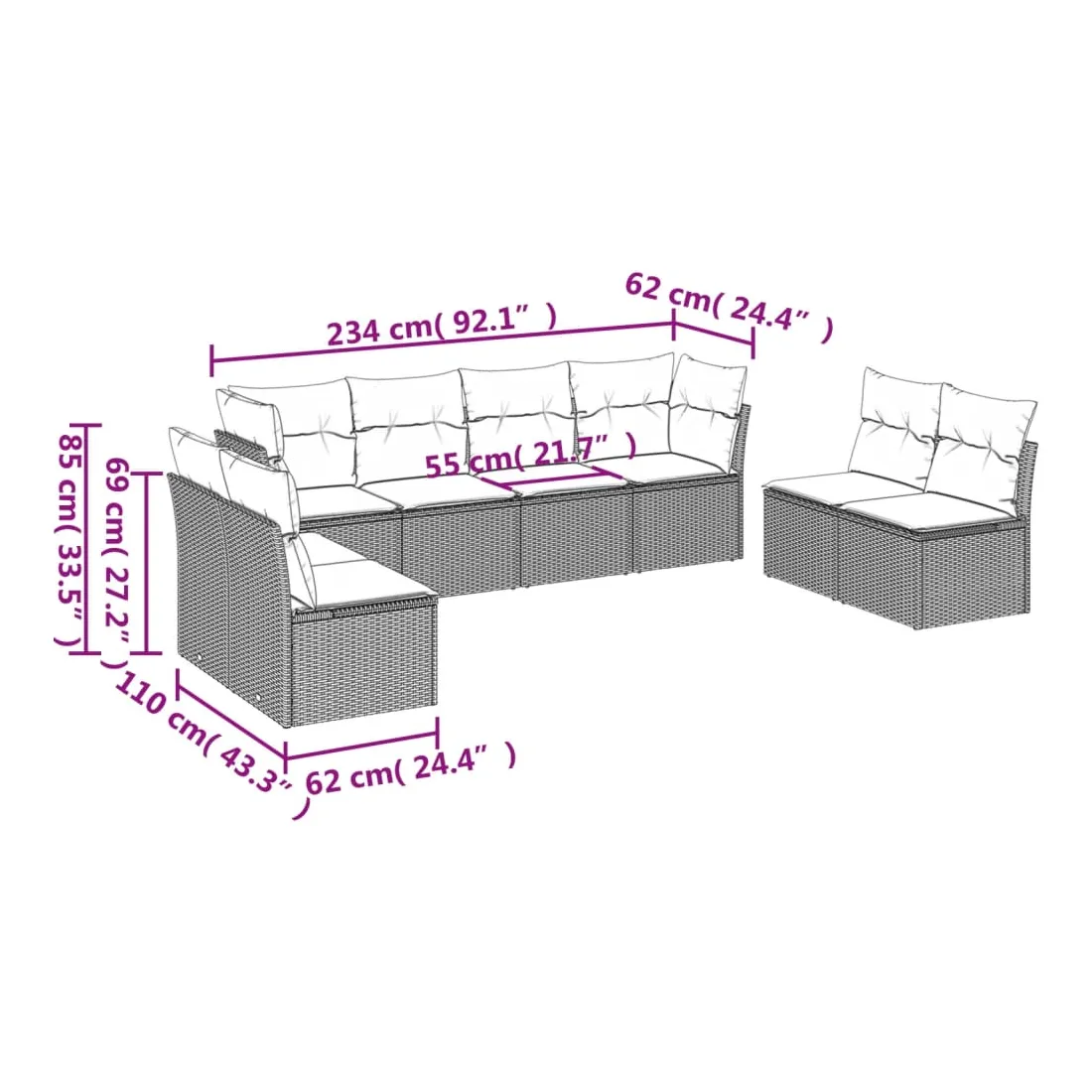 Cet ensemble de canapés de jardin est le complément parfait de votre arrière-cour, terrasse ou patio, offrant un espace confortable et accueillant pour discuter avec la famille et les amis ou simplement se détendre et profiter de l'extérieur. Matériau durable : la résine tressée, également connue sous le nom de poly rotin, est un matériau synthétique solide et nécessitant peu d'entretien qui ressemble au rotin naturel. Il est léger, facile à nettoyer et couramment utilisé pour les meubles d'extérieur en raison de sa durabilité et de ses propriétés de résistance aux intempéries.Expérience d'assise confortable : cet ensemble de meubles d'extérieur, doté de coussins épais, offre une expérience d'assise confortable.Housse amovible et lavable : ces coussins de siège sont dotés de housses amovibles pour un lavage et un entretien faciles.Conception modulaire : cet ensemble de meubles d'extérieur a une conception modulaire, ce qui le rend complètement flexible et facile à déplacer, afin que vous puissiez créer un agencement de meubles d'extérieur personnalisé. Bon à savoir :Pour que vos meubles d'extérieur restent beaux, nous vous recommandons de les protéger avec une housse imperméable.