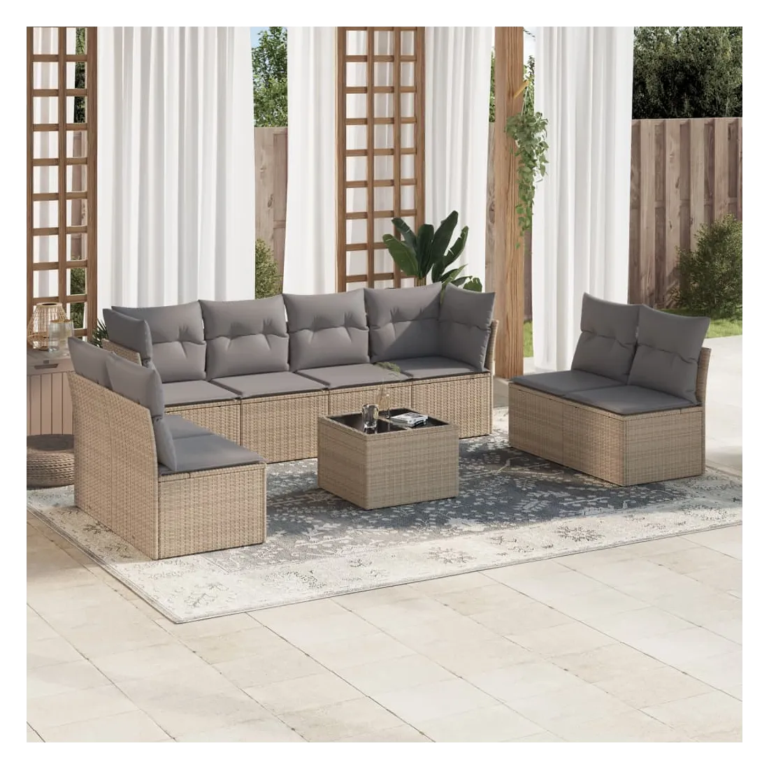 Cet ensemble de canapés de jardin est le complément parfait de votre arrière-cour, terrasse ou patio, offrant un espace confortable et accueillant pour discuter avec la famille et les amis ou simplement se détendre et profiter de l'extérieur. Matériau durable : la résine tressée, également connue sous le nom de poly rotin, est un matériau synthétique solide et nécessitant peu d'entretien qui ressemble au rotin naturel. Il est léger, facile à nettoyer et couramment utilisé pour les meubles d'extérieur en raison de sa durabilité et de ses propriétés de résistance aux intempéries.Expérience d'assise confortable : cet ensemble de meubles d'extérieur, doté de coussins épais, offre une expérience d'assise confortable.Housse amovible et lavable : ces coussins de siège sont dotés de housses amovibles pour un lavage et un entretien faciles.Dessus en verre : le dessus de la table d'extérieur est fabriqué en verre trempé solide et durable, ce qui le rend facile à nettoyer avec un chiffon humide et ajoute une touche d'élégance à votre espace extérieur.Conception modulaire : cet ensemble de meubles d'extérieur a une conception modulaire, ce qui le rend complètement flexible et facile à déplacer, afin que vous puissiez créer un agencement de meubles d'extérieur personnalisé. Bon à savoir :Pour que vos meubles d'extérieur restent beaux, nous vous recommandons de les protéger avec une housse imperméable.