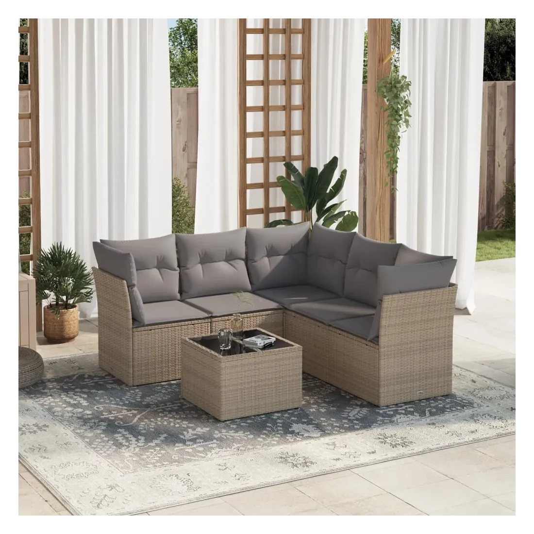Cet ensemble de canapés de jardin est le complément parfait de votre arrière-cour, terrasse ou patio, offrant un espace confortable et accueillant pour discuter avec la famille et les amis ou simplement se détendre et profiter de l'extérieur. Matériau durable : la résine tressée, également connue sous le nom de poly rotin, est un matériau synthétique solide et nécessitant peu d'entretien qui ressemble au rotin naturel. Il est léger, facile à nettoyer et couramment utilisé pour les meubles d'extérieur en raison de sa durabilité et de ses propriétés de résistance aux intempéries.Expérience d'assise confortable : cet ensemble de meubles d'extérieur, doté de coussins épais, offre une expérience d'assise confortable.Housse amovible et lavable : ces coussins de siège sont dotés de housses amovibles pour un lavage et un entretien faciles.Dessus en verre : le dessus de la table d'extérieur est fabriqué en verre trempé solide et durable, ce qui le rend facile à nettoyer avec un chiffon humide et ajoute une touche d'élégance à votre espace extérieur.Conception modulaire : cet ensemble de meubles d'extérieur a une conception modulaire, ce qui le rend complètement flexible et facile à déplacer, afin que vous puissiez créer un agencement de meubles d'extérieur personnalisé. Bon à savoir :Pour que vos meubles d'extérieur restent beaux, nous vous recommandons de les protéger avec une housse imperméable.
