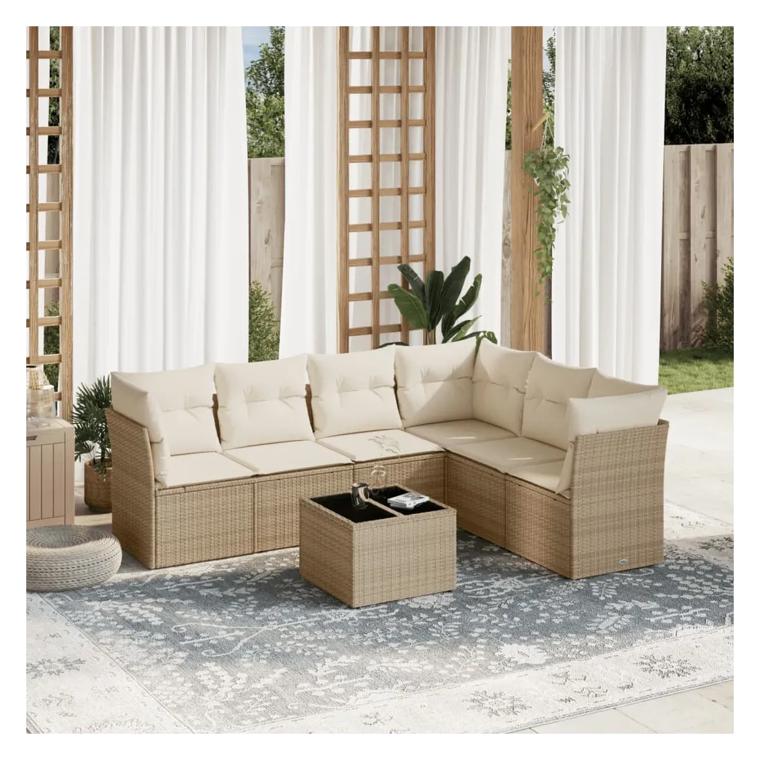 Cet ensemble de canapés de jardin est le complément parfait de votre arrière-cour, terrasse ou patio, offrant un espace confortable et accueillant pour discuter avec la famille et les amis ou simplement se détendre et profiter de l'extérieur. Matériau durable : la résine tressée, également connue sous le nom de poly rotin, est un matériau synthétique solide et nécessitant peu d'entretien qui ressemble au rotin naturel. Il est léger, facile à nettoyer et couramment utilisé pour les meubles d'extérieur en raison de sa durabilité et de ses propriétés de résistance aux intempéries.Expérience d'assise confortable : ce mobilier d'extérieur, doté de coussins épais, offre une expérience d'assise confortable.Dessus en verre : le dessus de la table d'extérieur est fabriqué en verre trempé solide et durable, ce qui le rend facile à nettoyer avec un chiffon humide et ajoute une touche d'élégance à votre espace extérieur.Housse amovible et lavable : ces coussins de siège sont dotés de housses amovibles pour un lavage et un entretien faciles.Conception modulaire : cet ensemble de meubles d'extérieur a une conception modulaire, ce qui le rend complètement flexible et facile à déplacer, afin que vous puissiez créer un agencement de meubles d'extérieur personnalisé. Bon à savoir :Pour que vos meubles d'extérieur restent beaux, nous vous recommandons de les protéger avec une housse imperméable.