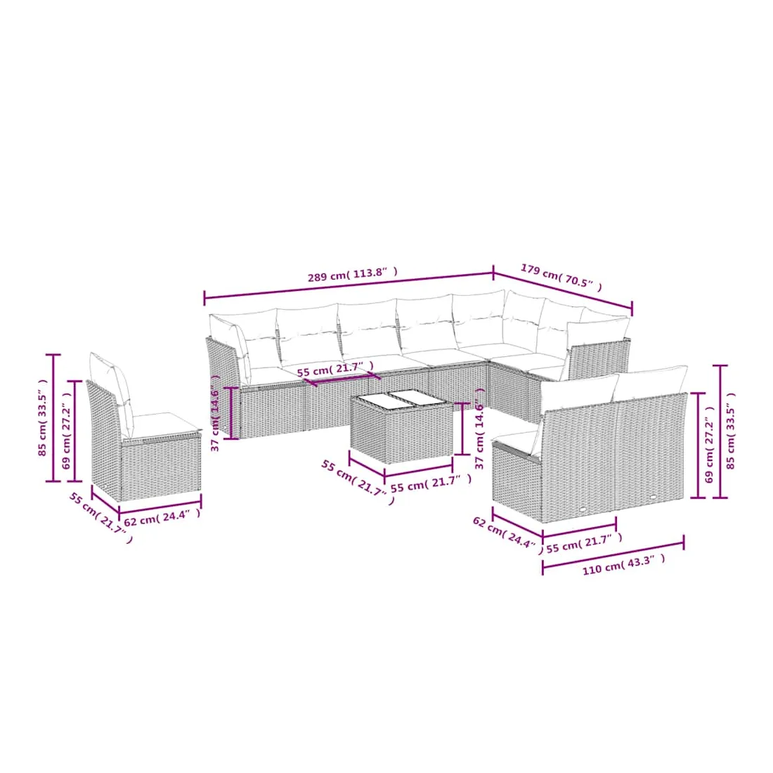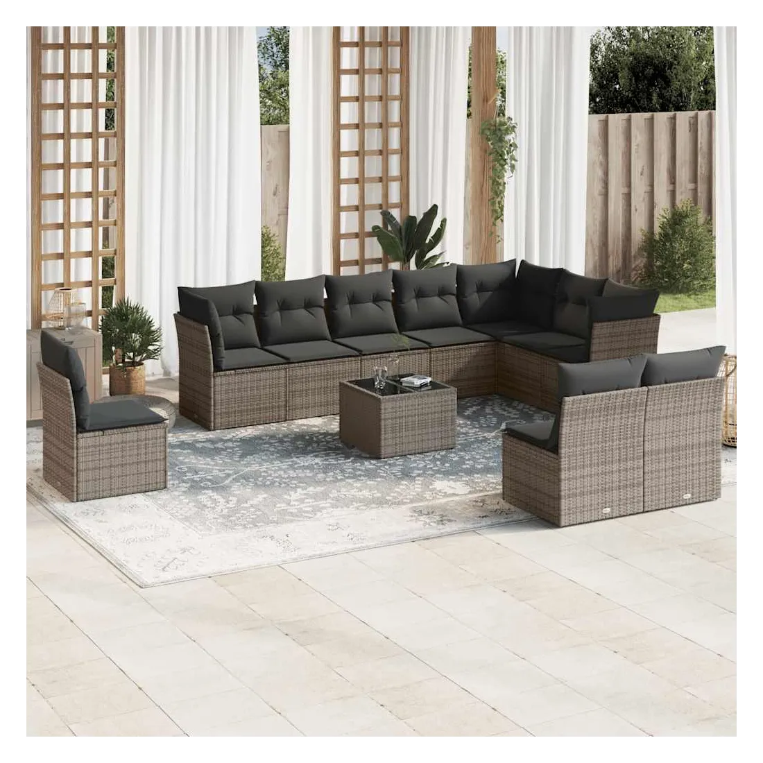 Cet ensemble de canapés de jardin est le complément parfait de votre arrière-cour, terrasse ou patio, offrant un espace confortable et accueillant pour discuter avec la famille et les amis ou simplement se détendre et profiter de l'extérieur. Matériau durable : la résine tressée, également connue sous le nom de poly rotin, est un matériau synthétique solide et nécessitant peu d'entretien qui ressemble au rotin naturel. Il est léger, facile à nettoyer et couramment utilisé pour les meubles d'extérieur en raison de sa durabilité et de ses propriétés de résistance aux intempéries.Expérience d'assise confortable : ce mobilier d'extérieur, doté de coussins épais, offre une expérience d'assise confortable.Dessus en verre : le dessus de la table d'extérieur est fabriqué en verre trempé solide et durable, ce qui le rend facile à nettoyer avec un chiffon humide et ajoute une touche d'élégance à votre espace extérieur.Housse amovible et lavable : ces coussins de siège sont dotés de housses amovibles pour un lavage et un entretien faciles.Conception modulaire : cet ensemble de meubles d'extérieur a une conception modulaire, ce qui le rend complètement flexible et facile à déplacer, afin que vous puissiez créer un agencement de meubles d'extérieur personnalisé. Bon à savoir :Pour que vos meubles d'extérieur restent beaux, nous vous recommandons de les protéger avec une housse imperméable.