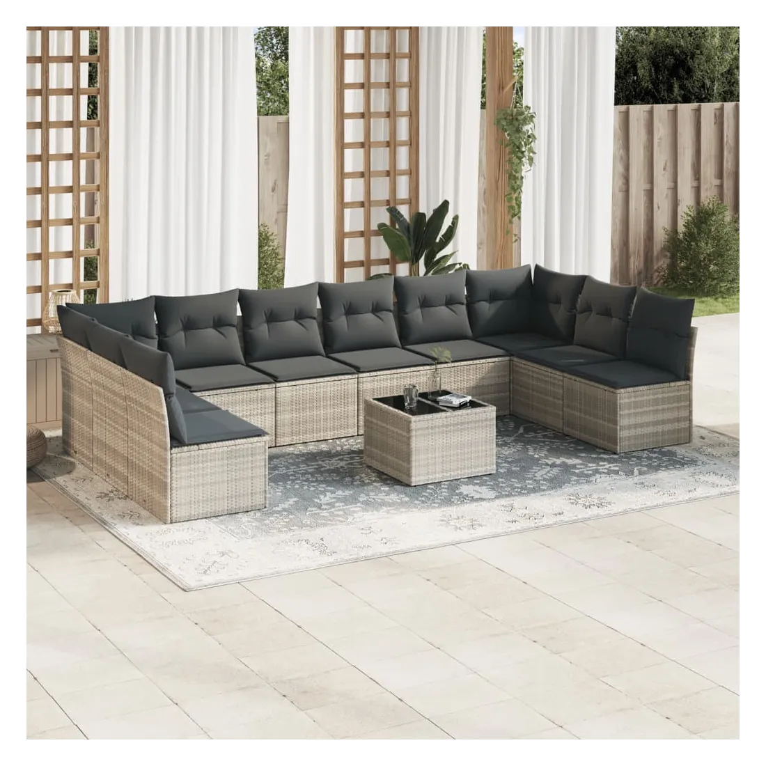 Cet ensemble de canapés de jardin est le complément parfait de votre arrière-cour, terrasse ou patio, offrant un espace confortable et accueillant pour discuter avec la famille et les amis ou simplement se détendre et profiter de l'extérieur. Matériau durable : la résine tressée, également connue sous le nom de poly rotin, est un matériau synthétique solide et nécessitant peu d'entretien qui ressemble au rotin naturel. Il est léger, facile à nettoyer et couramment utilisé pour les meubles d'extérieur en raison de sa durabilité et de ses propriétés de résistance aux intempéries.Expérience d'assise confortable : ce mobilier d'extérieur, doté de coussins épais, offre une expérience d'assise confortable.Dessus en verre : le dessus de la table d'extérieur est fabriqué en verre trempé solide et durable, ce qui le rend facile à nettoyer avec un chiffon humide et ajoute une touche d'élégance à votre espace extérieur.Housse amovible et lavable : ces coussins de siège sont dotés de housses amovibles pour un lavage et un entretien faciles.Conception modulaire : cet ensemble de meubles d'extérieur a une conception modulaire, ce qui le rend complètement flexible et facile à déplacer, afin que vous puissiez créer un agencement de meubles d'extérieur personnalisé. Bon à savoir :Pour que vos meubles d'extérieur restent beaux, nous vous recommandons de les protéger avec une housse imperméable.