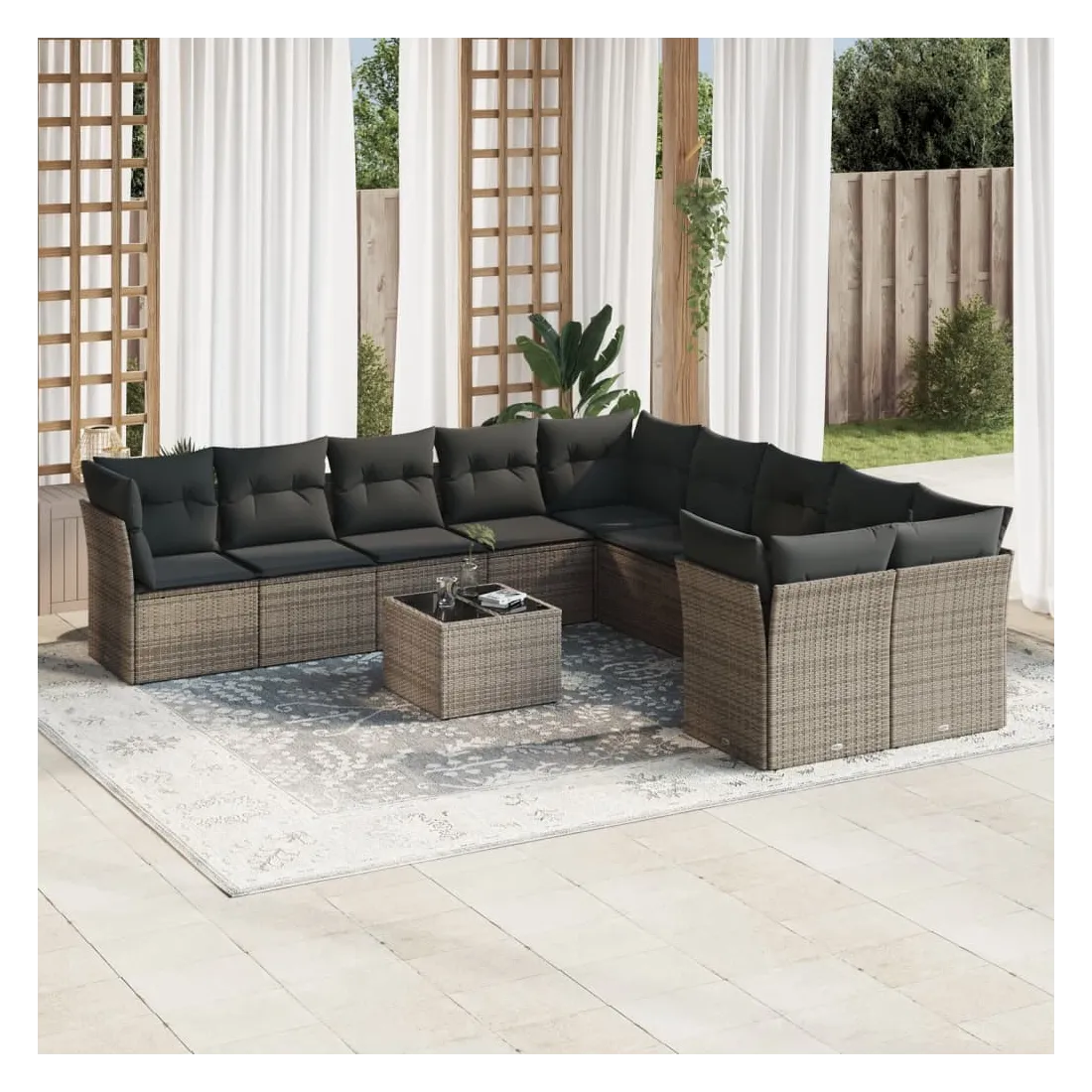 Cet ensemble de canapés de jardin est le complément parfait de votre arrière-cour, terrasse ou patio, offrant un espace confortable et accueillant pour discuter avec la famille et les amis ou simplement se détendre et profiter de l'extérieur. Matériau durable : la résine tressée, également connue sous le nom de poly rotin, est un matériau synthétique solide et nécessitant peu d'entretien qui ressemble au rotin naturel. Il est léger, facile à nettoyer et couramment utilisé pour les meubles d'extérieur en raison de sa durabilité et de ses propriétés de résistance aux intempéries.Expérience d'assise confortable : ce mobilier d'extérieur, doté de coussins épais, offre une expérience d'assise confortable.Dessus en verre : le dessus de la table d'extérieur est fabriqué en verre trempé solide et durable, ce qui le rend facile à nettoyer avec un chiffon humide et ajoute une touche d'élégance à votre espace extérieur.Housse amovible et lavable : ces coussins de siège sont dotés de housses amovibles pour un lavage et un entretien faciles.Conception modulaire : cet ensemble de meubles d'extérieur a une conception modulaire, ce qui le rend complètement flexible et facile à déplacer, afin que vous puissiez créer un agencement de meubles d'extérieur personnalisé. Bon à savoir :Pour que vos meubles d'extérieur restent beaux, nous vous recommandons de les protéger avec une housse imperméable.