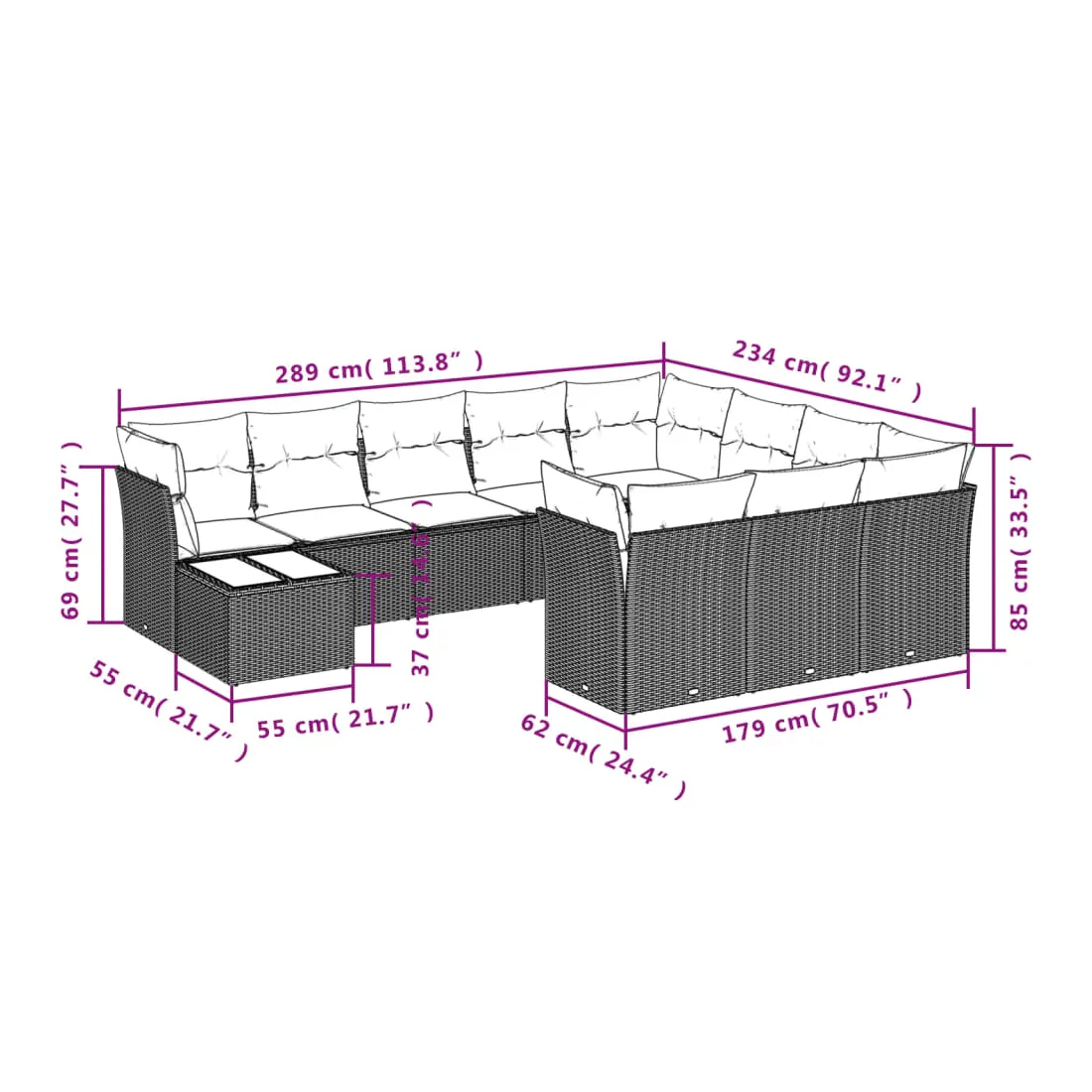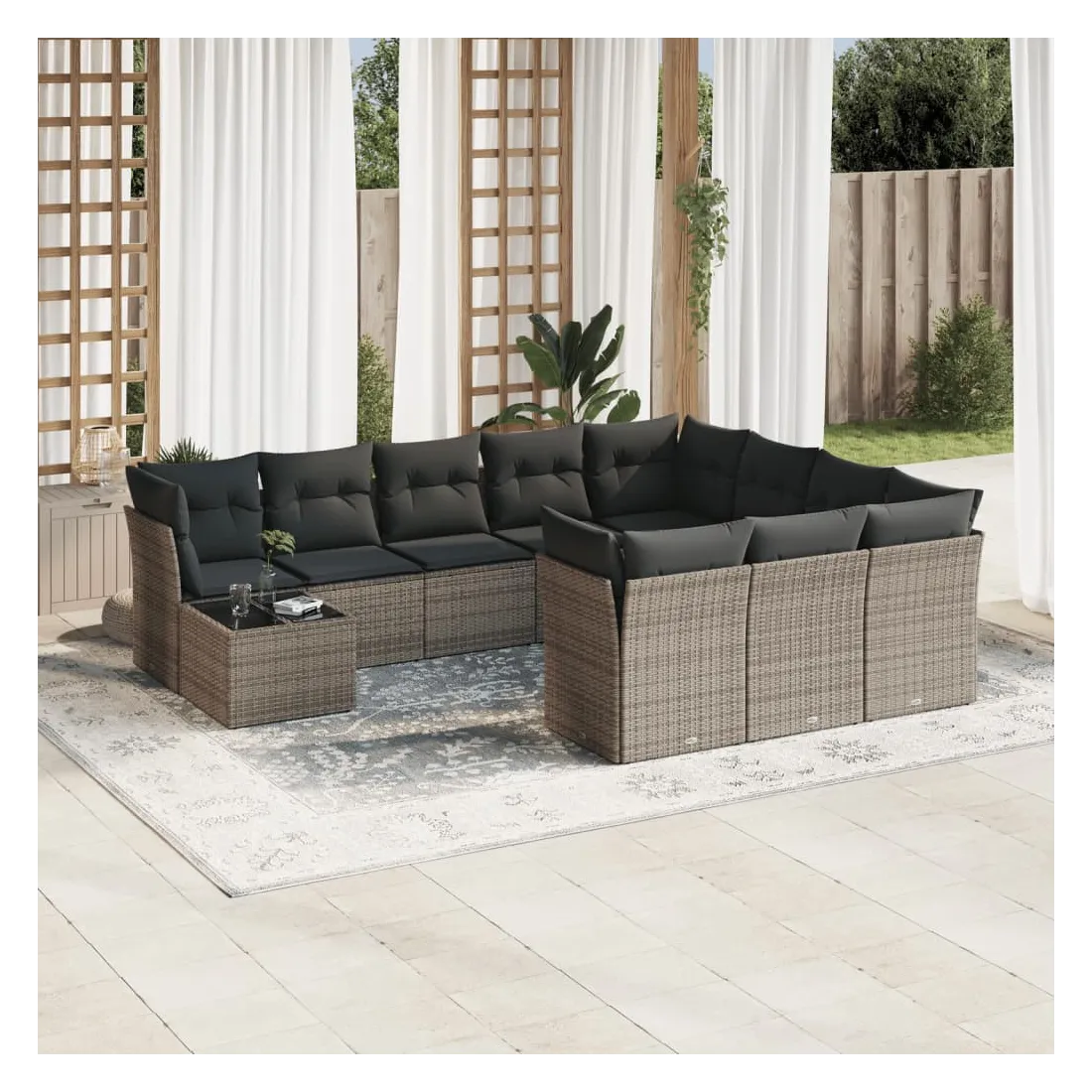 Cet ensemble de canapés de jardin est le complément parfait de votre arrière-cour, terrasse ou patio, offrant un espace confortable et accueillant pour discuter avec la famille et les amis ou simplement se détendre et profiter de l'extérieur. Matériau durable : la résine tressée, également connue sous le nom de poly rotin, est un matériau synthétique solide et nécessitant peu d'entretien qui ressemble au rotin naturel. Il est léger, facile à nettoyer et couramment utilisé pour les meubles d'extérieur en raison de sa durabilité et de ses propriétés de résistance aux intempéries.Expérience d'assise confortable : ce mobilier d'extérieur, doté de coussins épais, offre une expérience d'assise confortable.Dessus en verre : le dessus de la table d'extérieur est fabriqué en verre trempé solide et durable, ce qui le rend facile à nettoyer avec un chiffon humide et ajoute une touche d'élégance à votre espace extérieur.Housse amovible et lavable : ces coussins de siège sont dotés de housses amovibles pour un lavage et un entretien faciles.Conception modulaire : cet ensemble de meubles d'extérieur a une conception modulaire, ce qui le rend complètement flexible et facile à déplacer, afin que vous puissiez créer un agencement de meubles d'extérieur personnalisé. Bon à savoir :Pour que vos meubles d'extérieur restent beaux, nous vous recommandons de les protéger avec une housse imperméable.