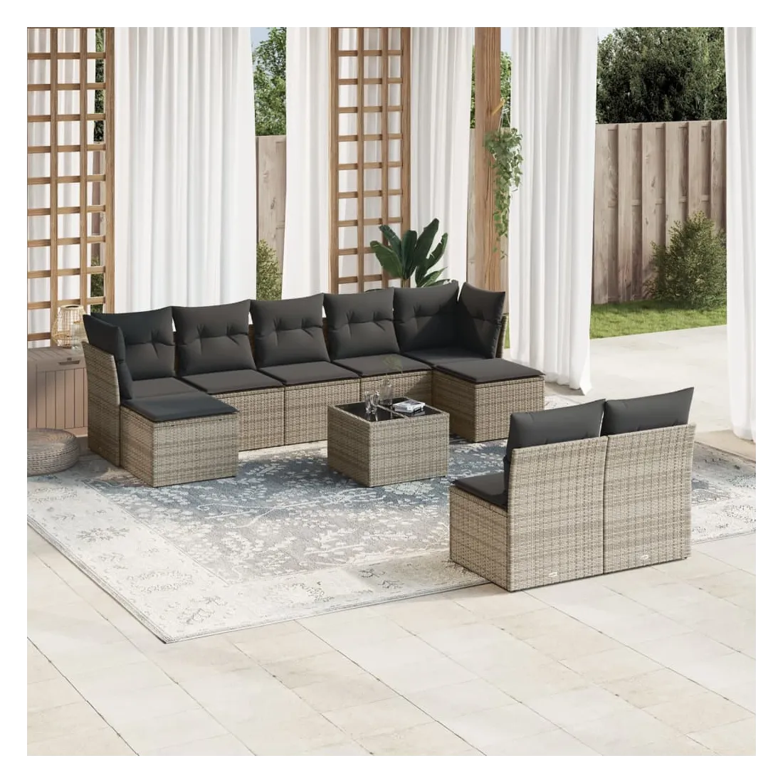 Cet ensemble de canapés de jardin est le complément parfait de votre arrière-cour, terrasse ou patio, offrant un espace confortable et accueillant pour discuter avec la famille et les amis ou simplement se détendre et profiter de l'extérieur. Matériau durable : la résine tressée, également connue sous le nom de poly rotin, est un matériau synthétique solide et nécessitant peu d'entretien qui ressemble au rotin naturel. Il est léger, facile à nettoyer et couramment utilisé pour les meubles d'extérieur en raison de sa durabilité et de ses propriétés de résistance aux intempéries.Expérience d'assise confortable : ce mobilier d'extérieur, doté de coussins épais, offre une expérience d'assise confortable.Dessus en verre : le dessus de la table d'extérieur est fabriqué en verre trempé solide et durable, ce qui le rend facile à nettoyer avec un chiffon humide et ajoute une touche d'élégance à votre espace extérieur.Housse amovible et lavable : ces coussins de siège sont dotés de housses amovibles pour un lavage et un entretien faciles.Conception modulaire : cet ensemble de meubles d'extérieur a une conception modulaire, ce qui le rend complètement flexible et facile à déplacer, afin que vous puissiez créer un agencement de meubles d'extérieur personnalisé. Bon à savoir :Pour que vos meubles d'extérieur restent beaux, nous vous recommandons de les protéger avec une housse imperméable.
