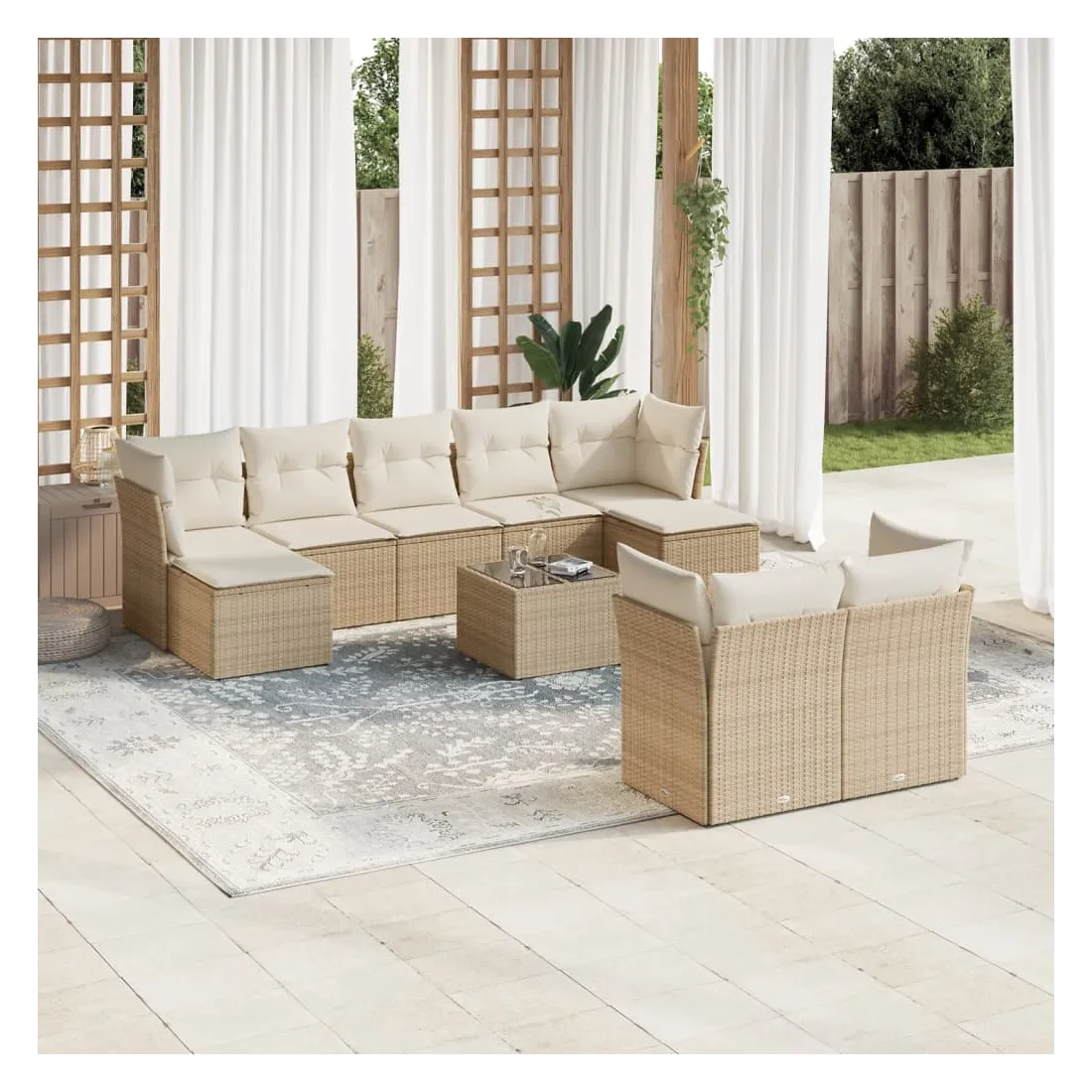 Cet ensemble de canapés de jardin est le complément parfait de votre arrière-cour, terrasse ou patio, offrant un espace confortable et accueillant pour discuter avec la famille et les amis ou simplement se détendre et profiter de l'extérieur. Matériau durable : la résine tressée, également connue sous le nom de poly rotin, est un matériau synthétique solide et nécessitant peu d'entretien qui ressemble au rotin naturel. Il est léger, facile à nettoyer et couramment utilisé pour les meubles d'extérieur en raison de sa durabilité et de ses propriétés de résistance aux intempéries.Expérience d'assise confortable : ce mobilier d'extérieur, doté de coussins épais, offre une expérience d'assise confortable.Dessus en verre : le dessus de la table d'extérieur est fabriqué en verre trempé solide et durable, ce qui le rend facile à nettoyer avec un chiffon humide et ajoute une touche d'élégance à votre espace extérieur.Housse amovible et lavable : ces coussins de siège sont dotés de housses amovibles pour un lavage et un entretien faciles.Conception modulaire : cet ensemble de meubles d'extérieur a une conception modulaire, ce qui le rend complètement flexible et facile à déplacer, afin que vous puissiez créer un agencement de meubles d'extérieur personnalisé. Bon à savoir :Pour que vos meubles d'extérieur restent beaux, nous vous recommandons de les protéger avec une housse imperméable.