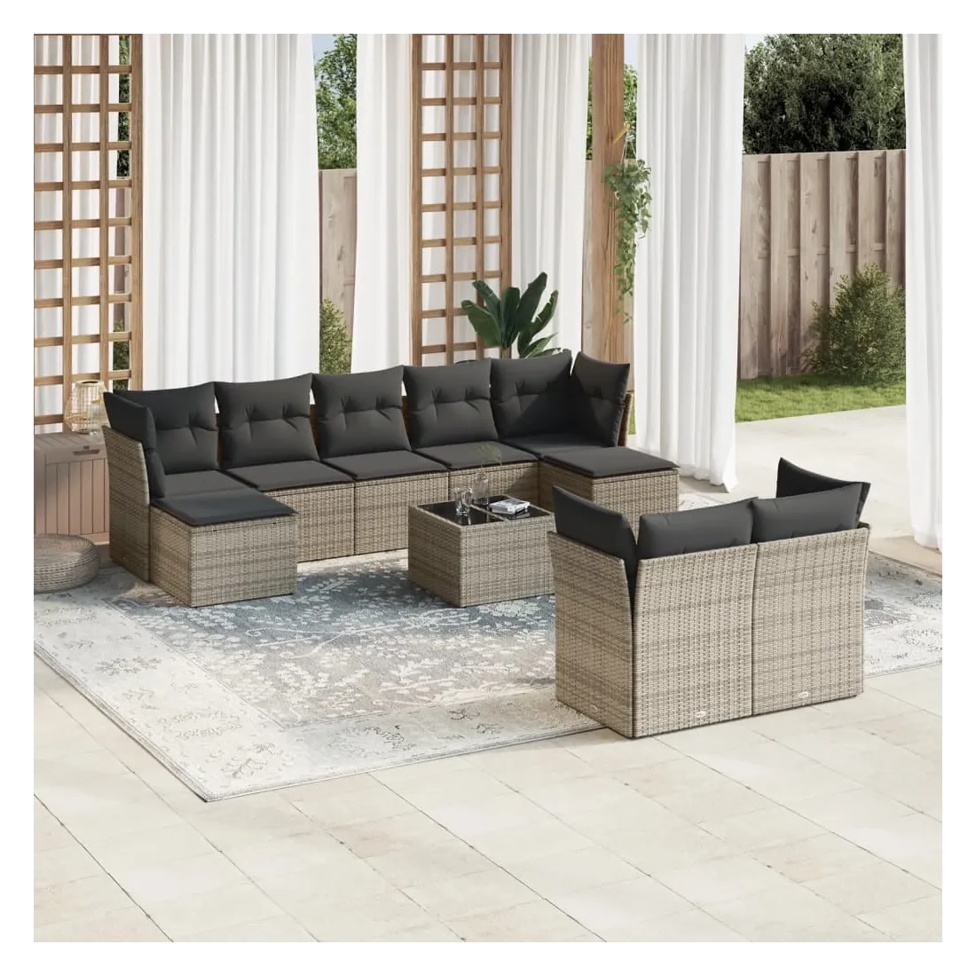 Cet ensemble de canapés de jardin est le complément parfait de votre arrière-cour, terrasse ou patio, offrant un espace confortable et accueillant pour discuter avec la famille et les amis ou simplement se détendre et profiter de l'extérieur. Matériau durable : la résine tressée, également connue sous le nom de poly rotin, est un matériau synthétique solide et nécessitant peu d'entretien qui ressemble au rotin naturel. Il est léger, facile à nettoyer et couramment utilisé pour les meubles d'extérieur en raison de sa durabilité et de ses propriétés de résistance aux intempéries.Expérience d'assise confortable : ce mobilier d'extérieur, doté de coussins épais, offre une expérience d'assise confortable.Dessus en verre : le dessus de la table d'extérieur est fabriqué en verre trempé solide et durable, ce qui le rend facile à nettoyer avec un chiffon humide et ajoute une touche d'élégance à votre espace extérieur.Housse amovible et lavable : ces coussins de siège sont dotés de housses amovibles pour un lavage et un entretien faciles.Conception modulaire : cet ensemble de meubles d'extérieur a une conception modulaire, ce qui le rend complètement flexible et facile à déplacer, afin que vous puissiez créer un agencement de meubles d'extérieur personnalisé. Bon à savoir :Pour que vos meubles d'extérieur restent beaux, nous vous recommandons de les protéger avec une housse imperméable.
