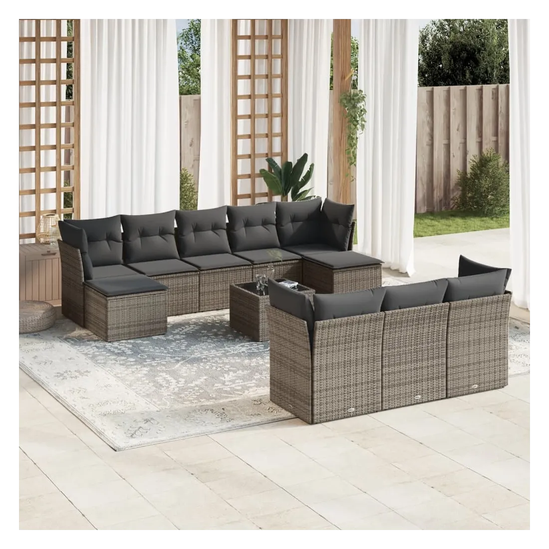 Cet ensemble de canapés de jardin est le complément parfait de votre arrière-cour, terrasse ou patio, offrant un espace confortable et accueillant pour discuter avec la famille et les amis ou simplement se détendre et profiter de l'extérieur. Matériau durable : la résine tressée, également connue sous le nom de poly rotin, est un matériau synthétique solide et nécessitant peu d'entretien qui ressemble au rotin naturel. Il est léger, facile à nettoyer et couramment utilisé pour les meubles d'extérieur en raison de sa durabilité et de ses propriétés de résistance aux intempéries.Expérience d'assise confortable : ce mobilier d'extérieur, doté de coussins épais, offre une expérience d'assise confortable.Dessus en verre : le dessus de la table d'extérieur est fabriqué en verre trempé solide et durable, ce qui le rend facile à nettoyer avec un chiffon humide et ajoute une touche d'élégance à votre espace extérieur.Housse amovible et lavable : ces coussins de siège sont dotés de housses amovibles pour un lavage et un entretien faciles.Conception modulaire : cet ensemble de meubles d'extérieur a une conception modulaire, ce qui le rend complètement flexible et facile à déplacer, afin que vous puissiez créer un agencement de meubles d'extérieur personnalisé. Bon à savoir :Pour que vos meubles d'extérieur restent beaux, nous vous recommandons de les protéger avec une housse imperméable.
