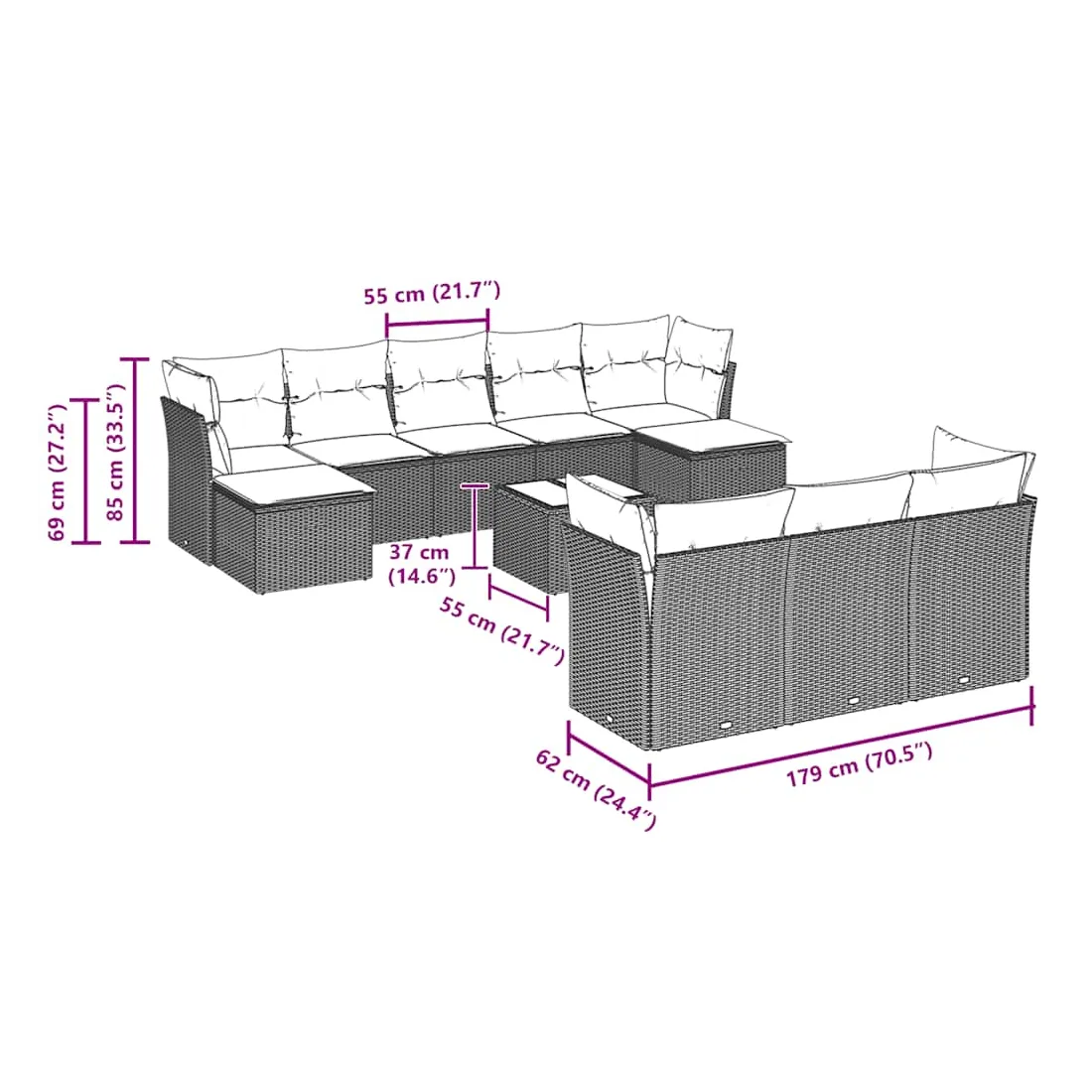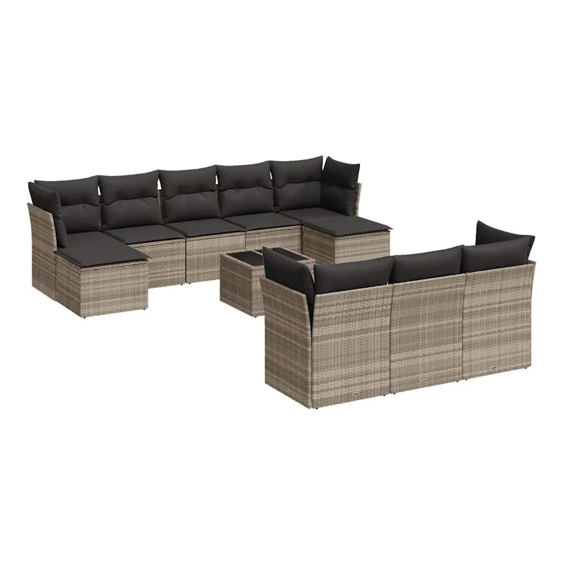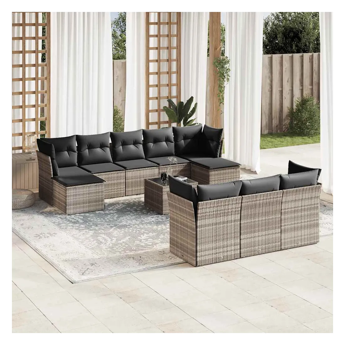 Cet ensemble de canapés de jardin est le complément parfait de votre arrière-cour, terrasse ou patio, offrant un espace confortable et accueillant pour discuter avec la famille et les amis ou simplement se détendre et profiter de l'extérieur. Matériau durable : la résine tressée, également connue sous le nom de poly rotin, est un matériau synthétique solide et nécessitant peu d'entretien qui ressemble au rotin naturel. Il est léger, facile à nettoyer et couramment utilisé pour les meubles d'extérieur en raison de sa durabilité et de ses propriétés de résistance aux intempéries.Expérience d'assise confortable : ce mobilier d'extérieur, doté de coussins épais, offre une expérience d'assise confortable.Dessus en verre : le dessus de la table d'extérieur est fabriqué en verre trempé solide et durable, ce qui le rend facile à nettoyer avec un chiffon humide et ajoute une touche d'élégance à votre espace extérieur.Housse amovible et lavable : ces coussins de siège sont dotés de housses amovibles pour un lavage et un entretien faciles.Conception modulaire : cet ensemble de meubles d'extérieur a une conception modulaire, ce qui le rend complètement flexible et facile à déplacer, afin que vous puissiez créer un agencement de meubles d'extérieur personnalisé. Bon à savoir :Pour que vos meubles d'extérieur restent beaux, nous vous recommandons de les protéger avec une housse imperméable.
