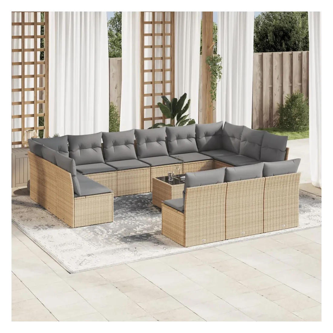 Cet ensemble de canapés de jardin est le complément parfait de votre arrière-cour, terrasse ou patio, offrant un espace confortable et accueillant pour discuter avec la famille et les amis ou simplement se détendre et profiter de l'extérieur. Matériau durable : la résine tressée, également connue sous le nom de poly rotin, est un matériau synthétique solide et nécessitant peu d'entretien qui ressemble au rotin naturel. Il est léger, facile à nettoyer et couramment utilisé pour les meubles d'extérieur en raison de sa durabilité et de ses propriétés de résistance aux intempéries.Expérience d'assise confortable : ce mobilier d'extérieur, doté de coussins épais, offre une expérience d'assise confortable.Dessus en verre : le dessus de la table d'extérieur est fabriqué en verre trempé solide et durable, ce qui le rend facile à nettoyer avec un chiffon humide et ajoute une touche d'élégance à votre espace extérieur.Housse amovible et lavable : ces coussins de siège sont dotés de housses amovibles pour un lavage et un entretien faciles.Conception modulaire : cet ensemble de meubles d'extérieur a une conception modulaire, ce qui le rend complètement flexible et facile à déplacer, afin que vous puissiez créer un agencement de meubles d'extérieur personnalisé. Bon à savoir :Pour que vos meubles d'extérieur restent beaux, nous vous recommandons de les protéger avec une housse imperméable.
