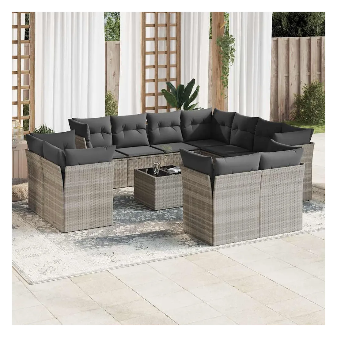 Cet ensemble de canapés de jardin est le complément parfait de votre arrière-cour, terrasse ou patio, offrant un espace confortable et accueillant pour discuter avec la famille et les amis ou simplement se détendre et profiter de l'extérieur. Matériau durable : la résine tressée, également connue sous le nom de poly rotin, est un matériau synthétique solide et nécessitant peu d'entretien qui ressemble au rotin naturel. Il est léger, facile à nettoyer et couramment utilisé pour les meubles d'extérieur en raison de sa durabilité et de ses propriétés de résistance aux intempéries.Expérience d'assise confortable : ce mobilier d'extérieur, doté de coussins épais, offre une expérience d'assise confortable.Dessus en verre : le dessus de la table d'extérieur est fabriqué en verre trempé solide et durable, ce qui le rend facile à nettoyer avec un chiffon humide et ajoute une touche d'élégance à votre espace extérieur.Housse amovible et lavable : ces coussins de siège sont dotés de housses amovibles pour un lavage et un entretien faciles.Conception modulaire : cet ensemble de meubles d'extérieur a une conception modulaire, ce qui le rend complètement flexible et facile à déplacer, afin que vous puissiez créer un agencement de meubles d'extérieur personnalisé. Bon à savoir :Pour que vos meubles d'extérieur restent beaux, nous vous recommandons de les protéger avec une housse imperméable.