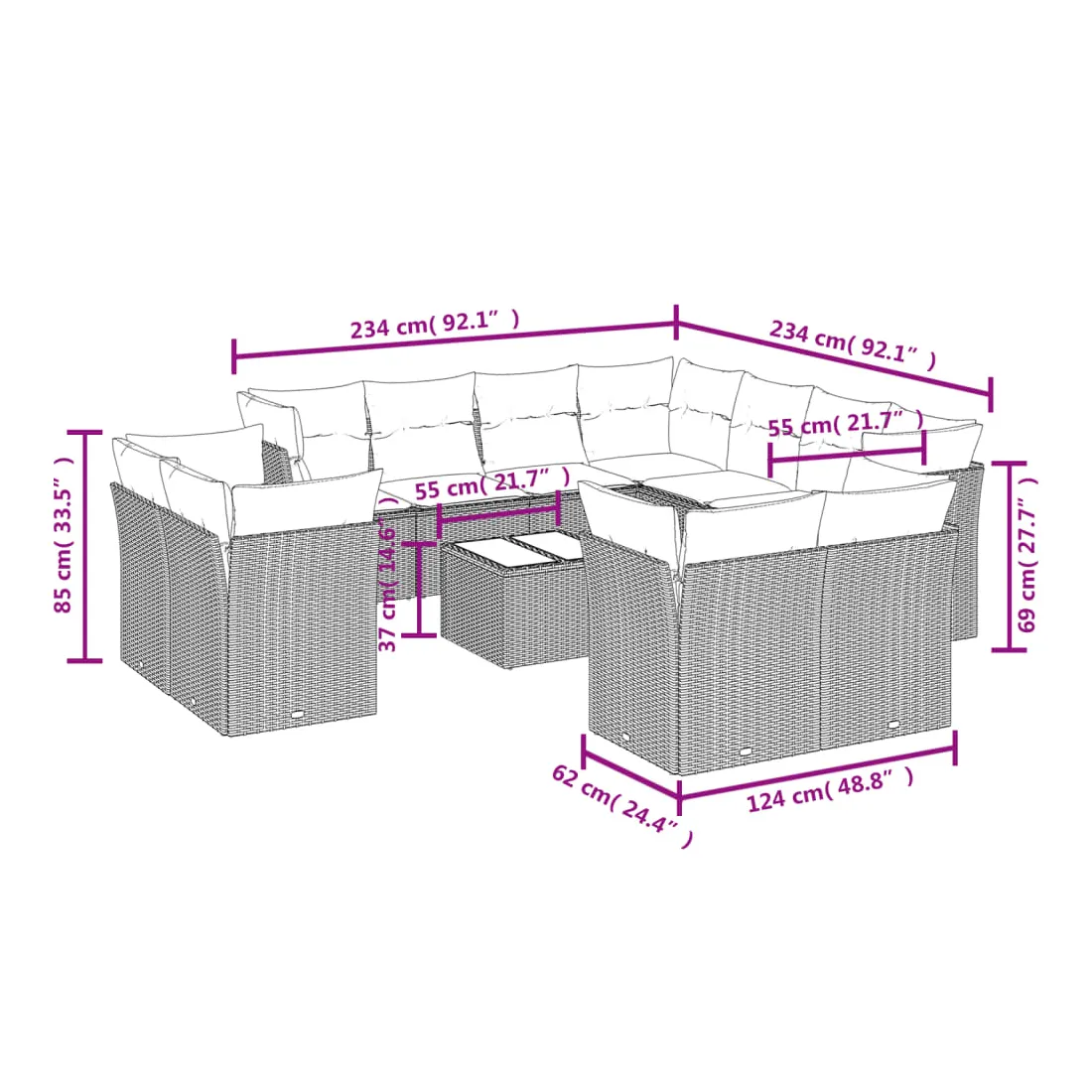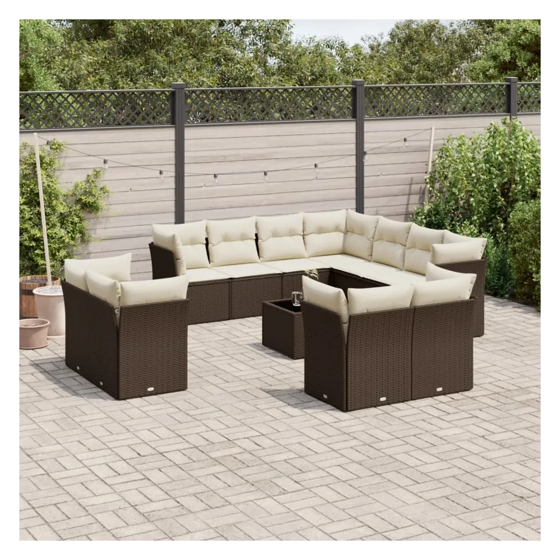 Cet ensemble de canapés de jardin est le complément parfait de votre arrière-cour, terrasse ou patio, offrant un espace confortable et accueillant pour discuter avec la famille et les amis ou simplement se détendre et profiter de l'extérieur. Matériau durable : la résine tressée, également connue sous le nom de poly rotin, est un matériau synthétique solide et nécessitant peu d'entretien qui ressemble au rotin naturel. Il est léger, facile à nettoyer et couramment utilisé pour les meubles d'extérieur en raison de sa durabilité et de ses propriétés de résistance aux intempéries.Expérience d'assise confortable : ce mobilier d'extérieur, doté de coussins épais, offre une expérience d'assise confortable.Dessus en verre : le dessus de la table d'extérieur est fabriqué en verre trempé solide et durable, ce qui le rend facile à nettoyer avec un chiffon humide et ajoute une touche d'élégance à votre espace extérieur.Housse amovible et lavable : ces coussins de siège sont dotés de housses amovibles pour un lavage et un entretien faciles.Conception modulaire : cet ensemble de meubles d'extérieur a une conception modulaire, ce qui le rend complètement flexible et facile à déplacer, afin que vous puissiez créer un agencement de meubles d'extérieur personnalisé. Bon à savoir :Pour que vos meubles d'extérieur restent beaux, nous vous recommandons de les protéger avec une housse imperméable.